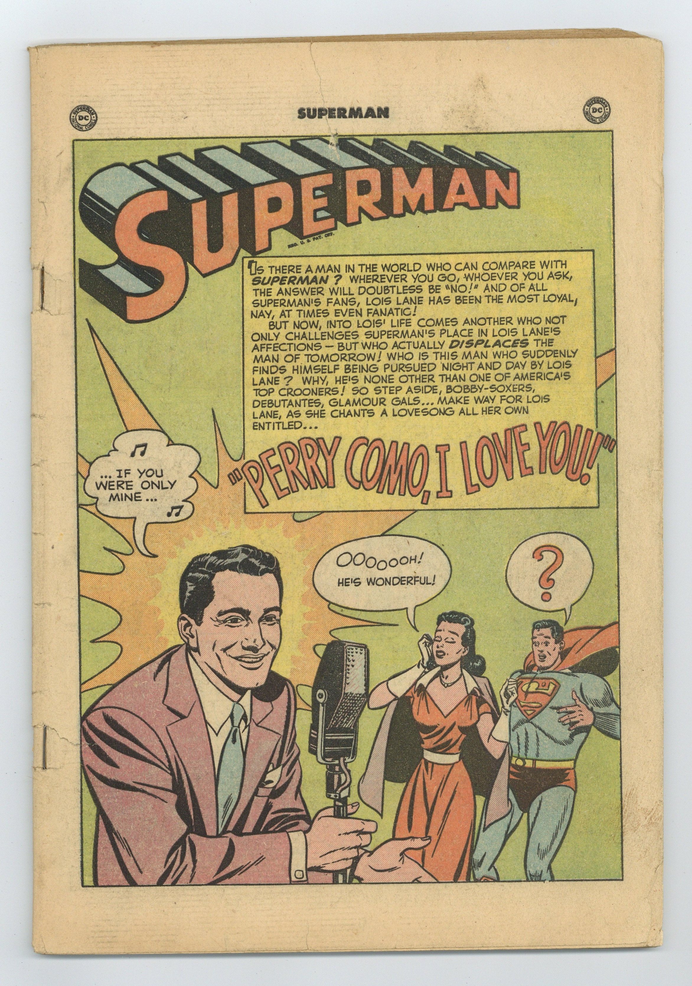Cover art by Al Plastino. Perry Como, I Love You, script by William Woolfolk, art by Al Plastino; Lois wins a contest to sing on a record with Perry Como, much to the chagrin of a crooked record company who want their star to shine instead. Little Pete humor page by Henry Boltinoff. The City Under the Sea, script by Alvin Schwartz, art by Al Plastino; Superman finds a domed city where the Queen falls in love with Clark because he's so ordinary. Varsity Vic humor two-pager by Henry Boltinoff. Clark Kent's Twin, script by Alvin Schwartz, pencils by Wayne Boring, inks by Stan Kaye; Joe Poleski gets amnesia and thinks he's Clark Kent. Nature Loves a Nature-Lover public service announcement starring Buzzy, script by Jack Schiff, art by Win Mortimer. Full-page ad for Strange Adventures # 2. Cover features Perry Como. 52 Pages, Full Color. Cover price $0.10.