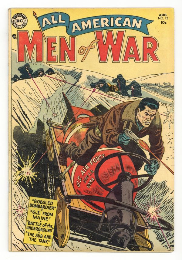 $75.00Edited by Whitney Ellsworth and Robert Kanigher. Cover by Jerry Grandenetti. Stories by Causin, Gil Kane, Sam Burlockoff, Robert Stuart, Irwin Hasen, Bill Woolfolk, and Russ Heath. Adventure tales of war and the military, including some humor—go into combat with All American Men of War! 36 Pages, Full Color. Cover price $0.10.