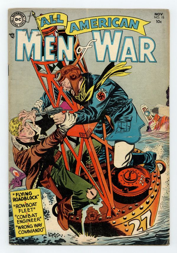 "Flying Roadblock," "Combat Engineer," "Wrong Way Commando," and "The Row Boat Fleet!" Edited by Whitney Ellsworth and Robert Kanigher. Cover by Jerry Grandenetti. Stories by David V. Reed, Arthur Peddy, Causin, Irwin Hasen, Eugene Hughes, Bernard Sachs, Ed Herron, and Mort Meskin. Adventure tales of war and the military, including some humor—go into combat with All American Men of War! 36 Pages, Full Color. Cover price $0.10.