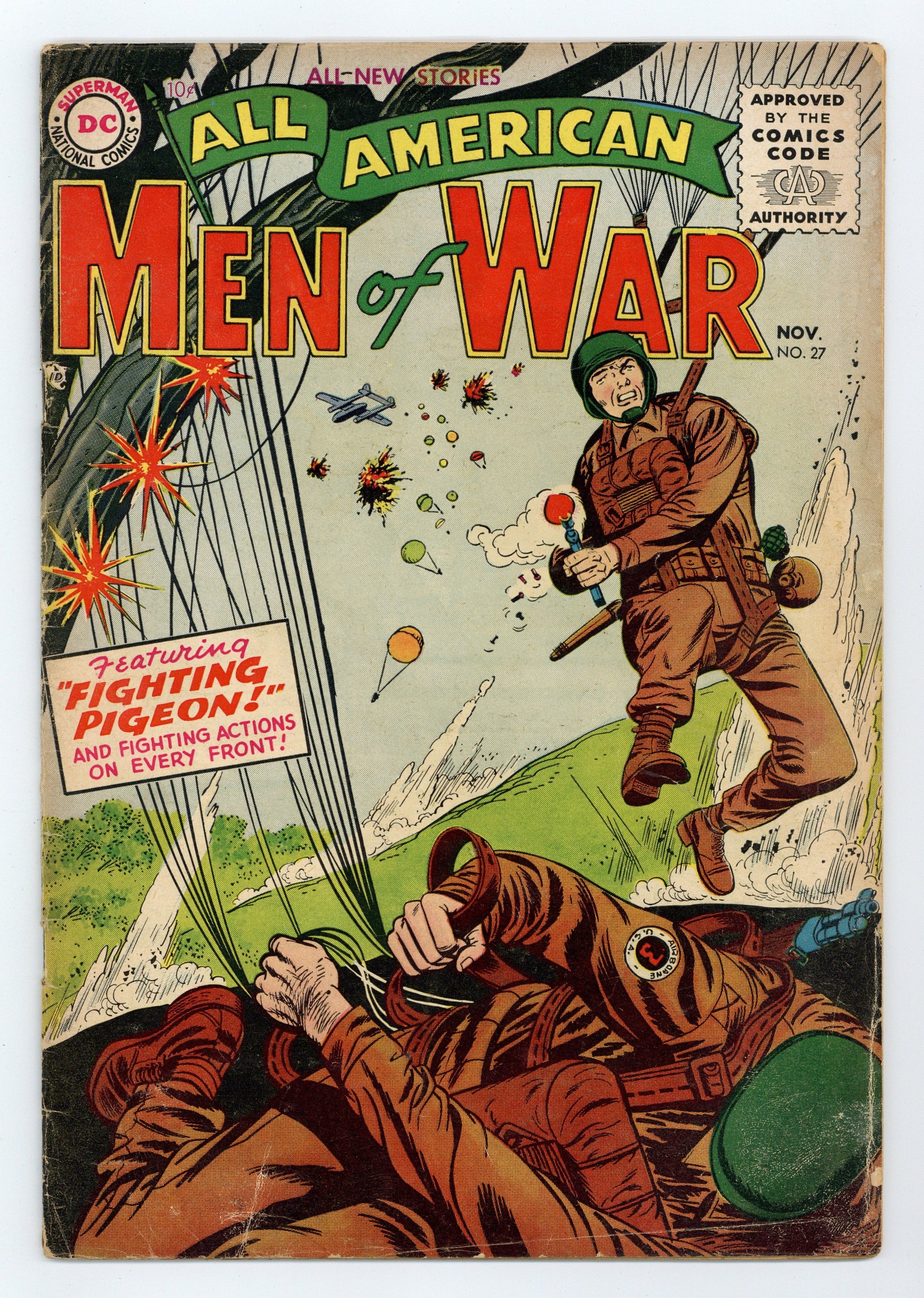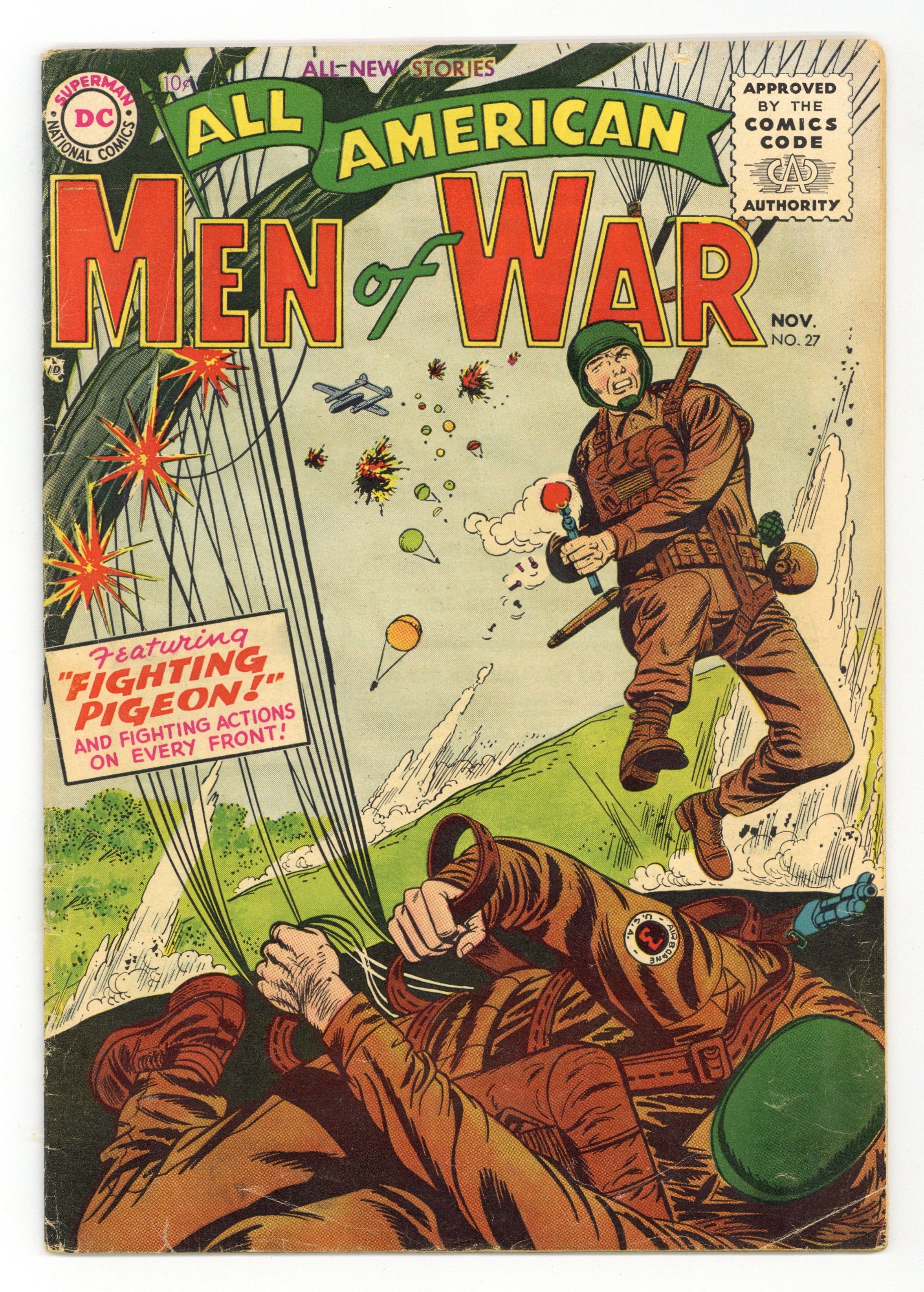 "Fighting Pigeon" (art by Russ Heath), "Fix-It Fighter," "The Rifle on Treads," and "Bazooka in the Sky." Edited by Whitney Ellsworth and Robert Kanigher. Cover by Jerry Grandenetti. Stories by Robert Kanigher, Russ Heath, Ed Herron, Bob Forgione, Jack Abel, Arthur Peddy, Bob Haney, Ross Andru, and Mike Esposito. Adventure tales of war and the military, including some humor—go into combat with All American Men of War! 36 Pages, Full Color. Cover price $0.10.