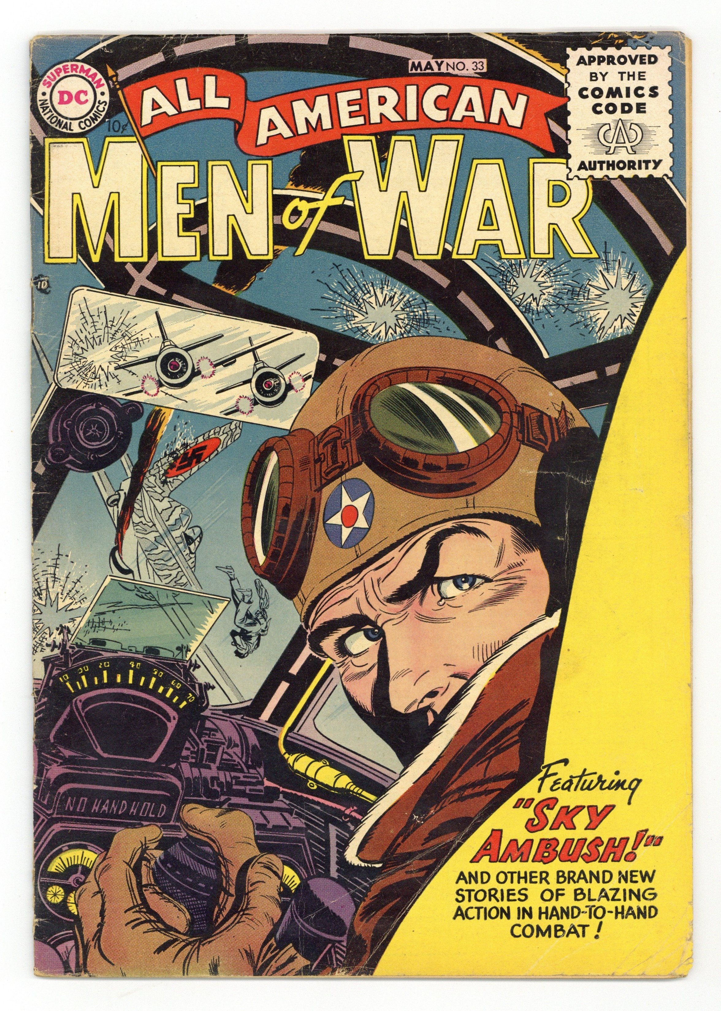 Edited by Whitney Ellsworth and Robert Kanigher. Cover by Jerry Grandenetti. Stories by Robert Kanigher, Irv Novick, Irwin Hasen, Bill Finger, Jerry Grandenetti, Henry Boltinoff, Dave Wood, Joe Kubert, Raymond Perry, Leo Isaacs, Bob Forgione, and Jack Abel. Adventure tales of war and the military, including some humor—go into combat with All American Men of War! 36 Pages, Full Color. Cover price $0.10.