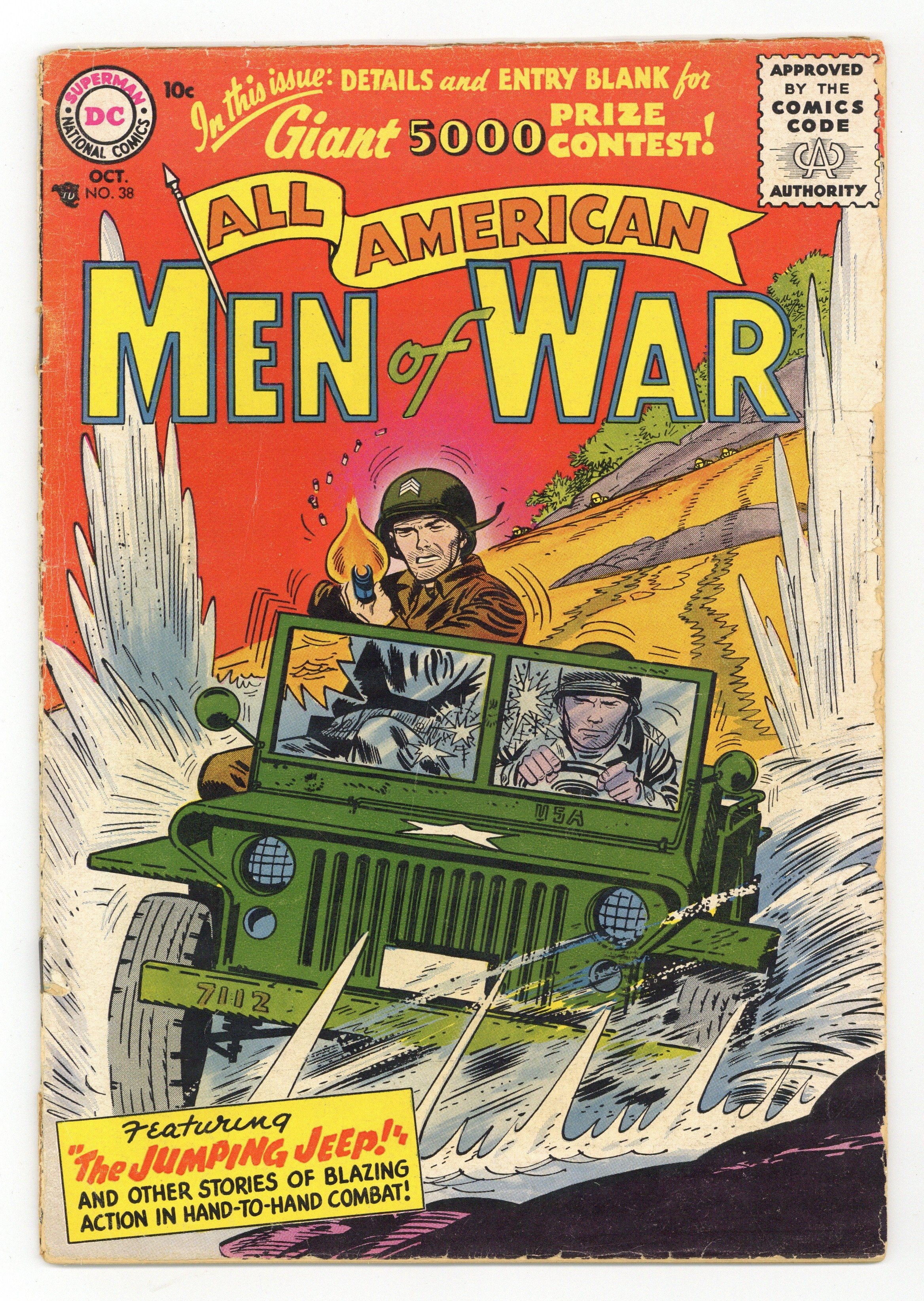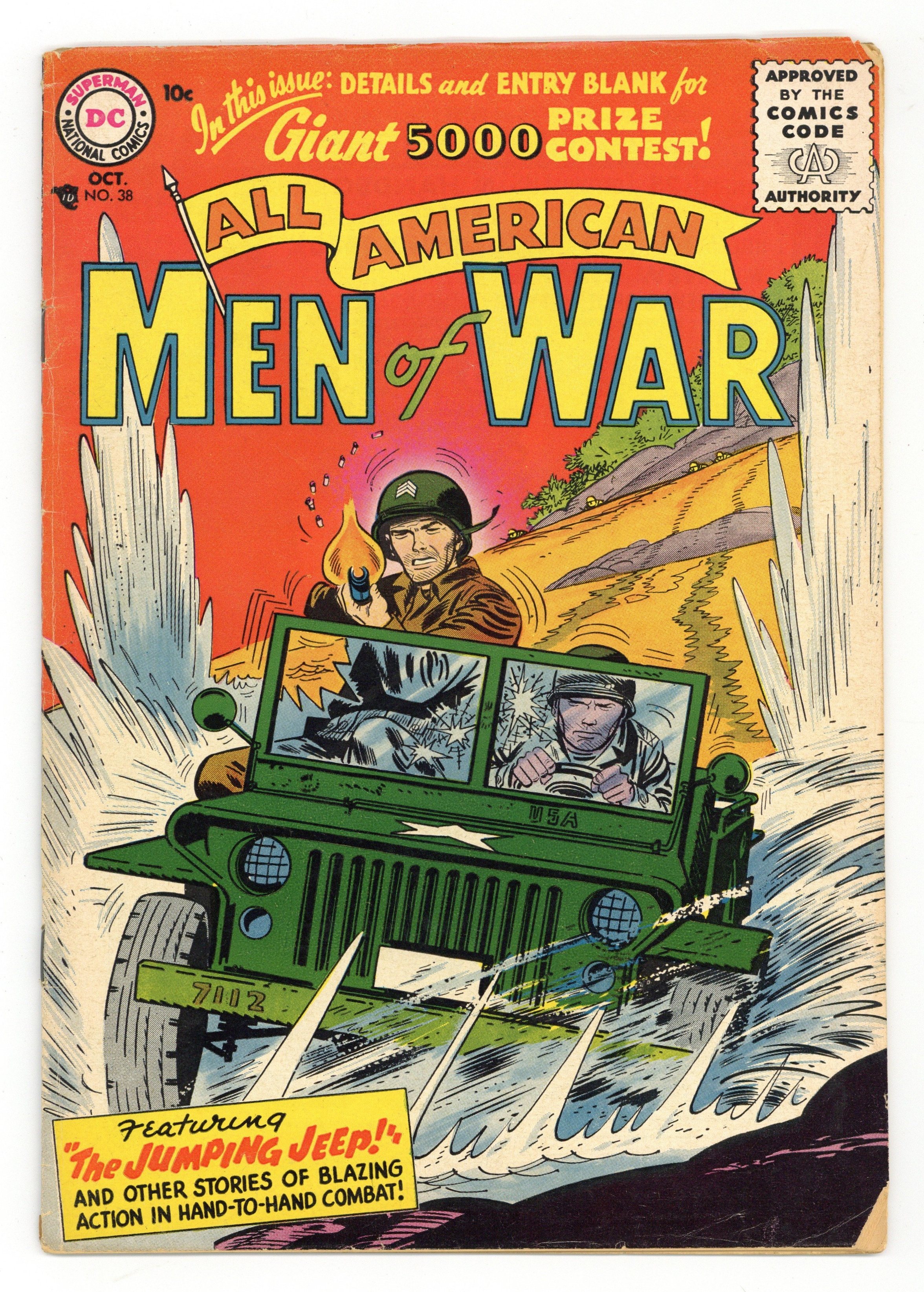 Edited by Whitney Ellsworth and Robert Kanigher. Cover by Jerry Grandenetti. Stories by Dave Wood, Ross Andru, Mike Esposito, Bob Haney, Russ Heath, Robert Kanigher, Joe Kubert, Bill Finger, and Jerry Grandenetti. Adventure tales of war and the military, including some humor—go into combat with All American Men of War! 36 Pages, Full Color. Cover price $0.10.