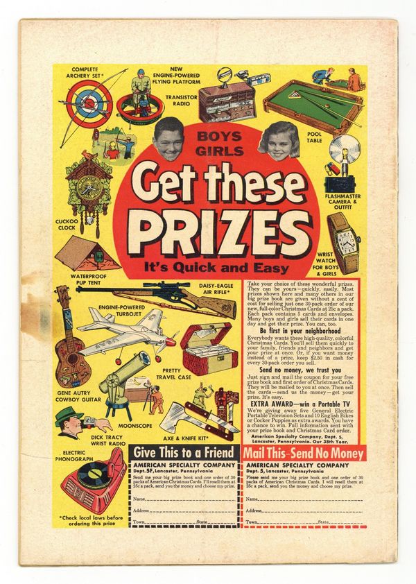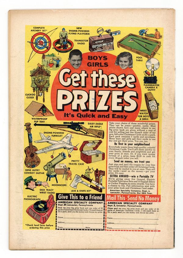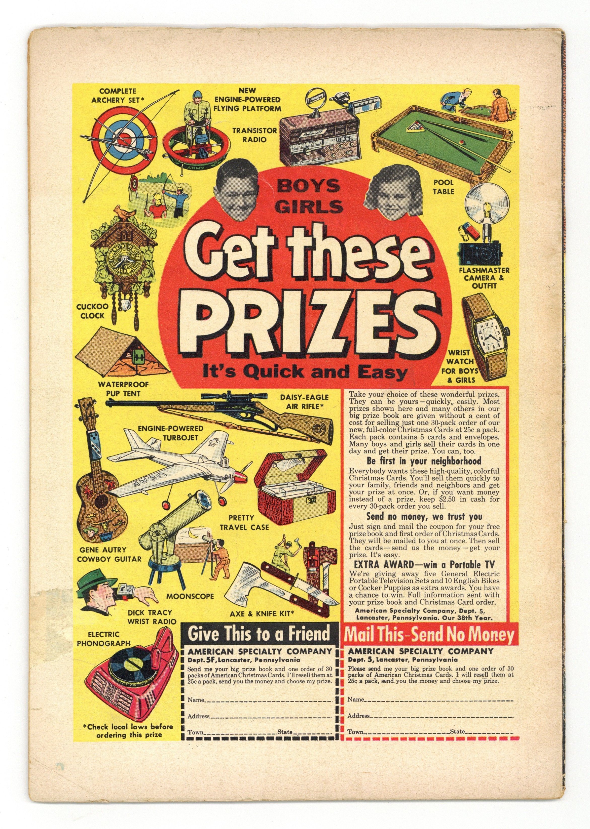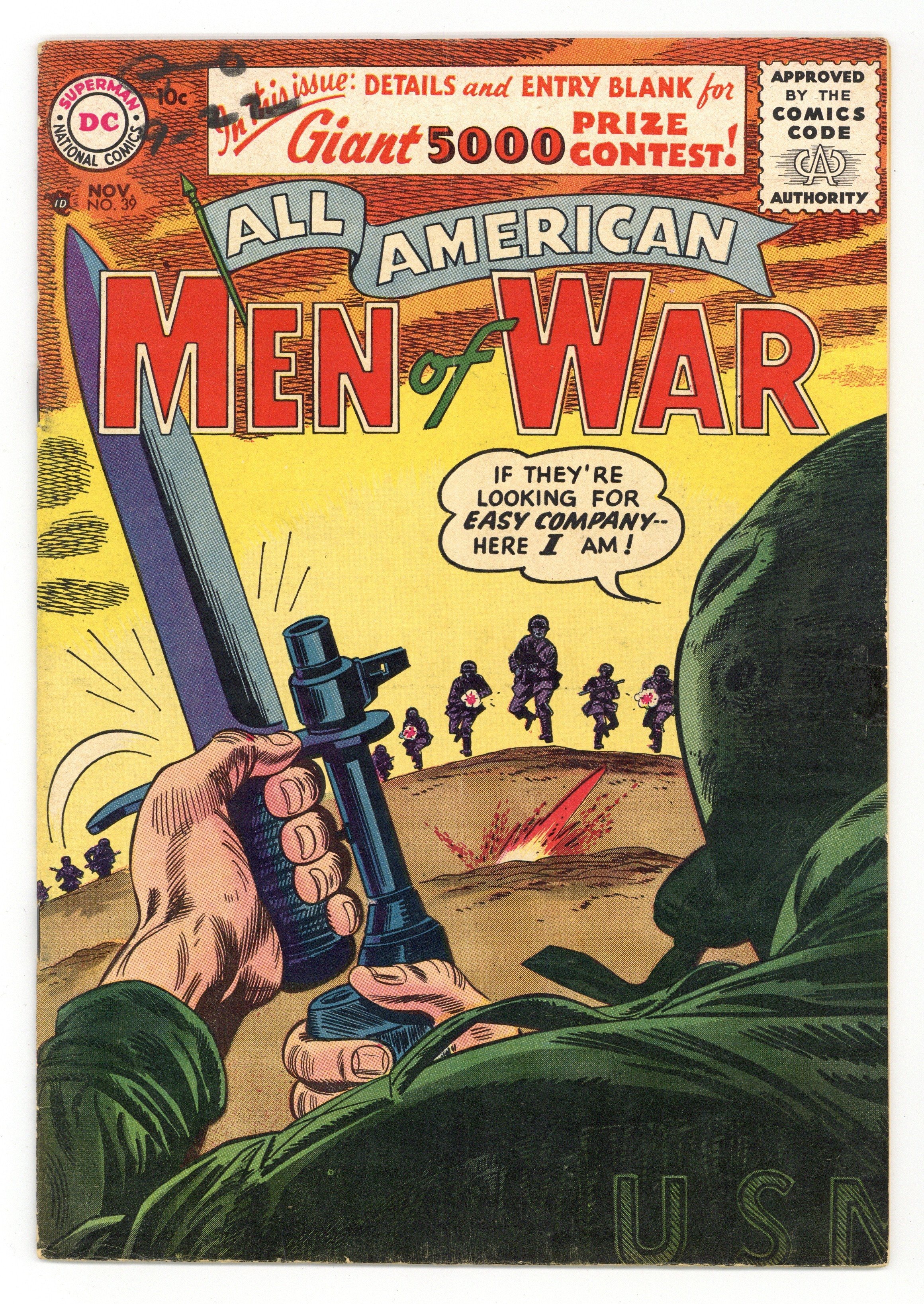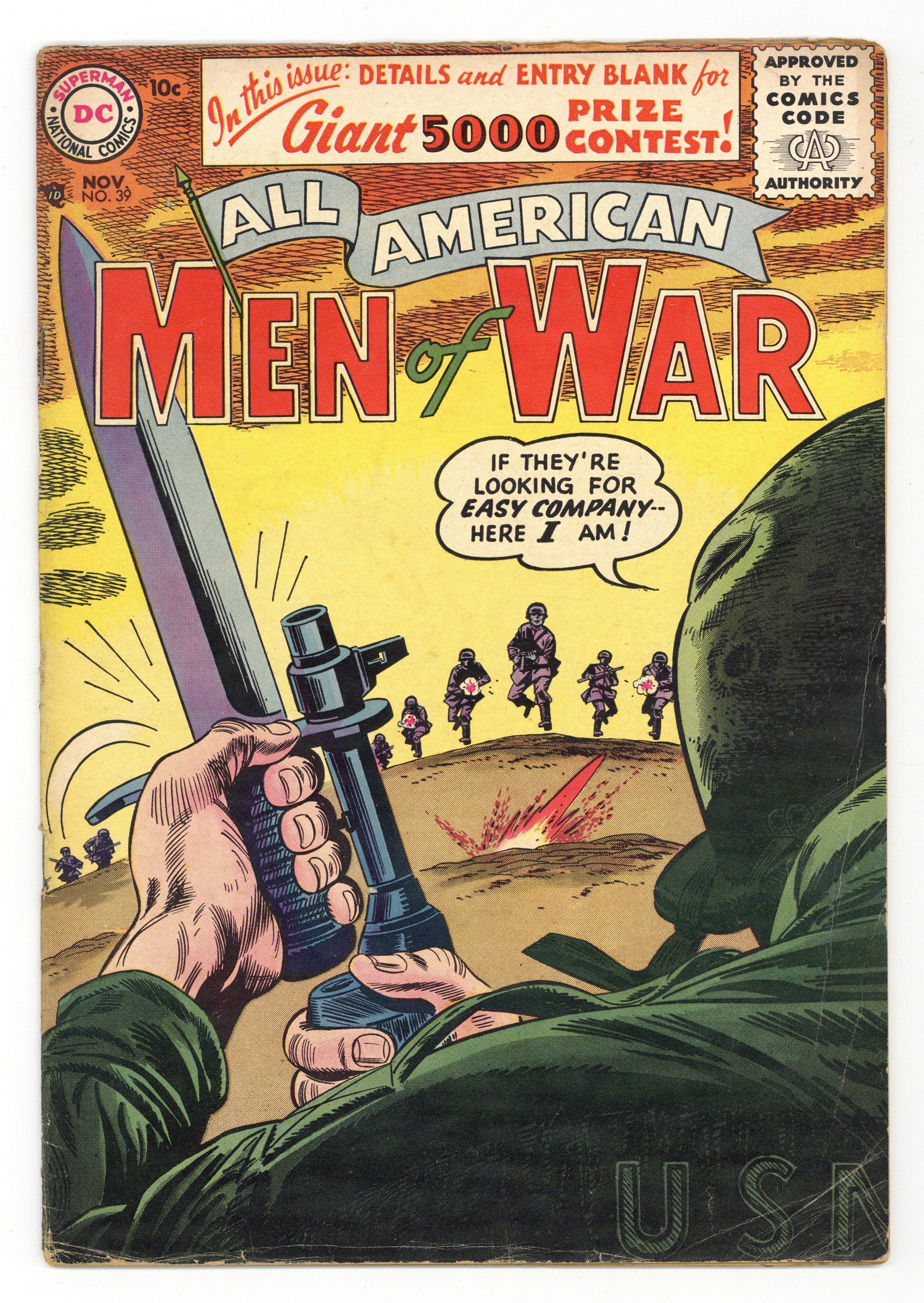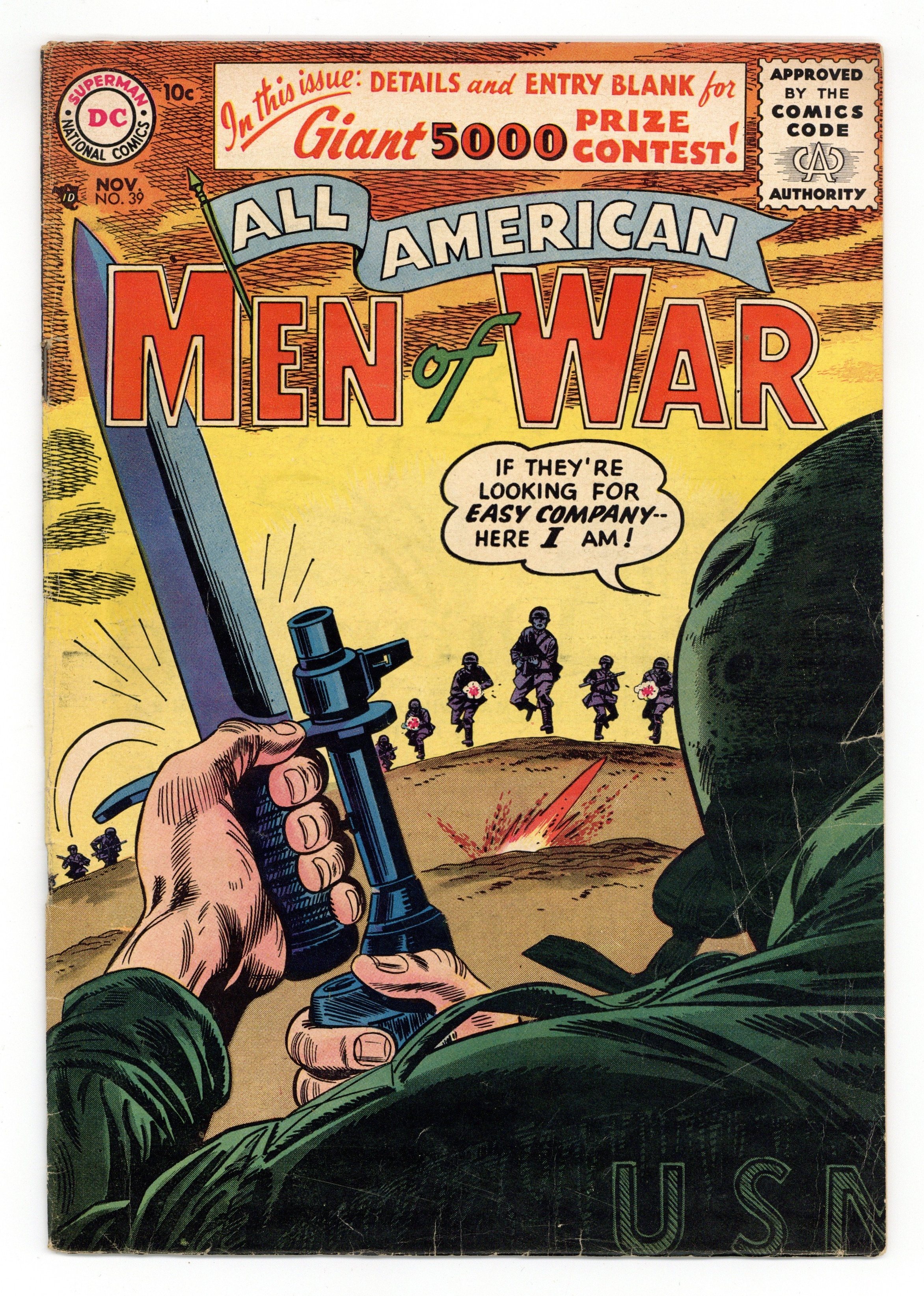 Edited by Whitney Ellsworth and Robert Kanigher. Cover by Jerry Grandenetti. Stories by Bill Finger, Joe Kubert, Henry Boltinoff, Bob Haney, Bob Brown, Robert Kanigher, Ross Andru, Mike Esposito, Irwin Hasen, and Bob Haney. Adventure tales of war and the military, including some humor—go into combat with All American Men of War! 36 Pages, Full Color. Cover price $0.10.