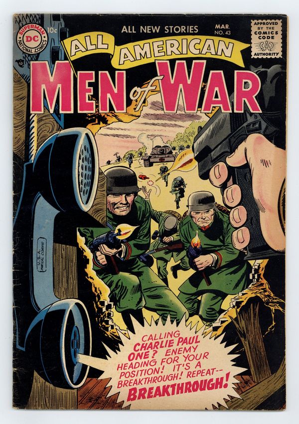 $17.00"Command Post!" (art by Joe Kubert); "Battle Windows"; "Dead End River," and "The Ant-Hill Soldier!" Edited by Whitney Ellsworth and Robert Kanigher. Cover by Jerry Grandenetti. Stories by Robert Kanigher, Joe Kubert, Jerry Grandenetti, Morris Waldinger, Tom Nicolisi, Bill Finger, Gene Colan, Joe Giella, Bob Haney, Ross Andru, and Mike Esposito. Adventure tales of war and the military, including some humor—go into combat with All American Men of War! 36 Pages, Full Color. Cover price $0.10.