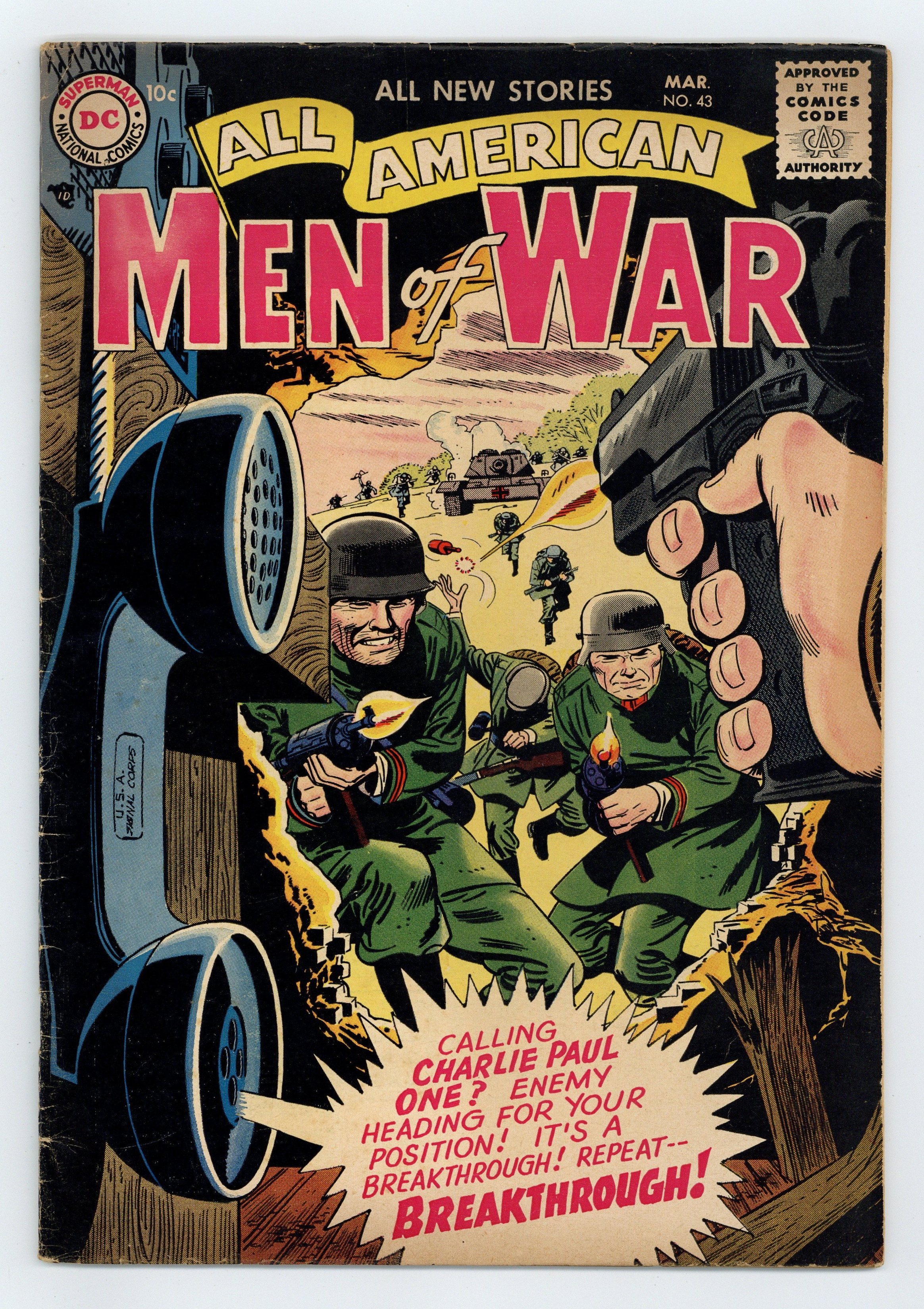 Starts Mar 2 "Command Post!" (art by Joe Kubert); "Battle Windows"; "Dead End River," and "The Ant-Hill Soldier!" Edited by Whitney Ellsworth and Robert Kanigher. Cover by Jerry Grandenetti. Stories by Robert Kanigher, Joe Kubert, Jerry Grandenetti, Morris Waldinger, Tom Nicolisi, Bill Finger, Gene Colan, Joe Giella, Bob Haney, Ross Andru, and Mike Esposito. Adventure tales of war and the military, including some humor—go into combat with All American Men of War! 36 Pages, Full Color. Cover price $0.10.