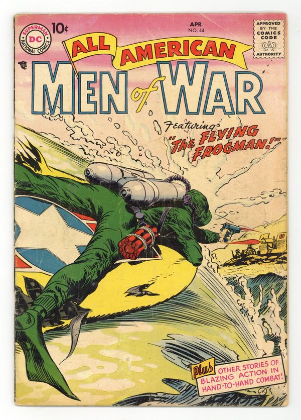 "The Flying Frogman," "Bullet Net," "Battle Colors," and "The Sixth Soldier" (art by Russ Heath). Edited by Whitney Ellsworth and Robert Kanigher. Cover by Joe Kubert. Stories by Robert Kanigher, Ross Andru, Mike Esposito, Bill Finger, Jack Abel, Morris Waldinger, Tom Nicolisi, Bill Finger, Jerry Grandenetti, and Russ Heath. Adventure tales of war and the military, including some humor—go into combat with All American Men of War! 36 Pages, Full Color. Cover price $0.10.