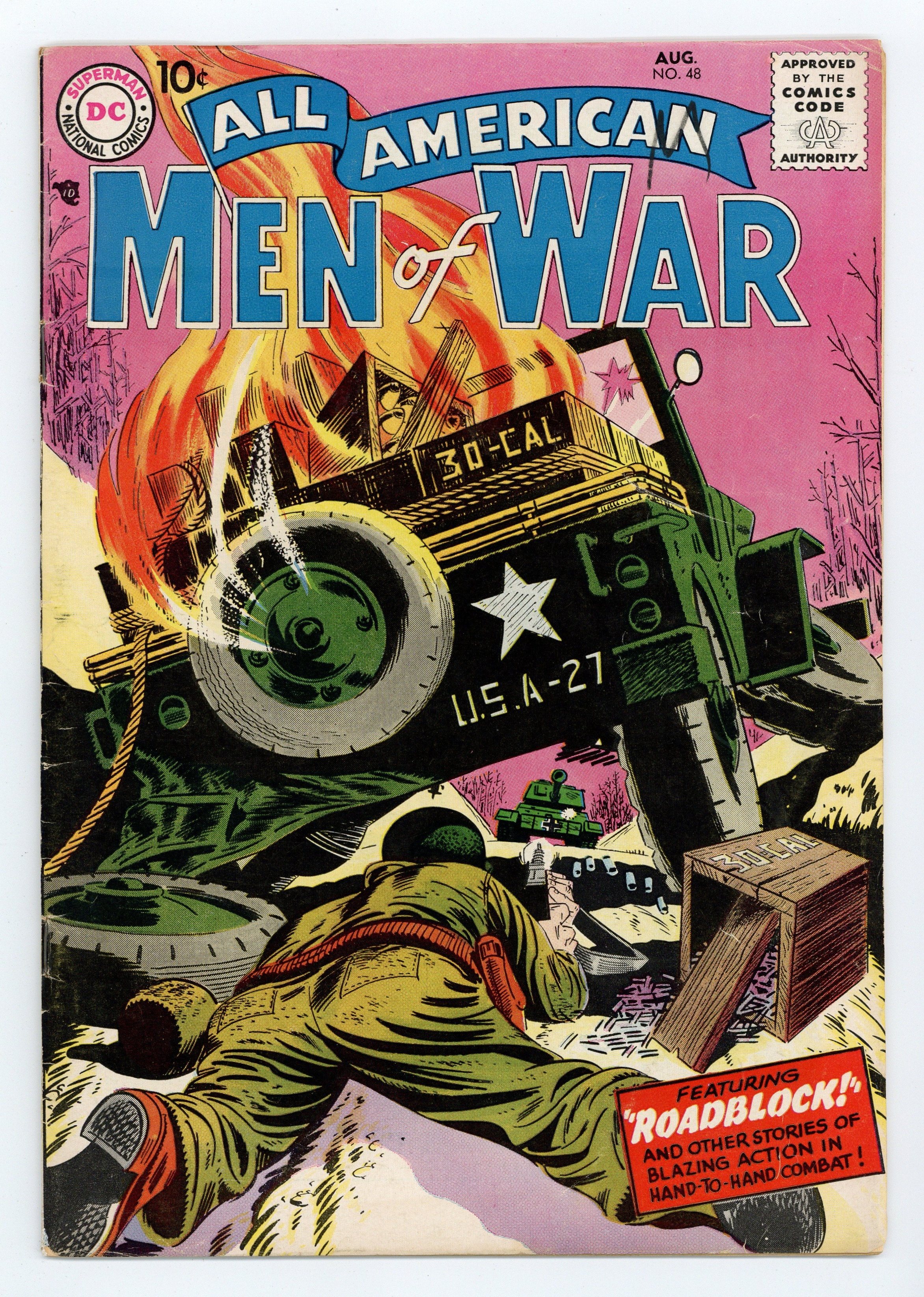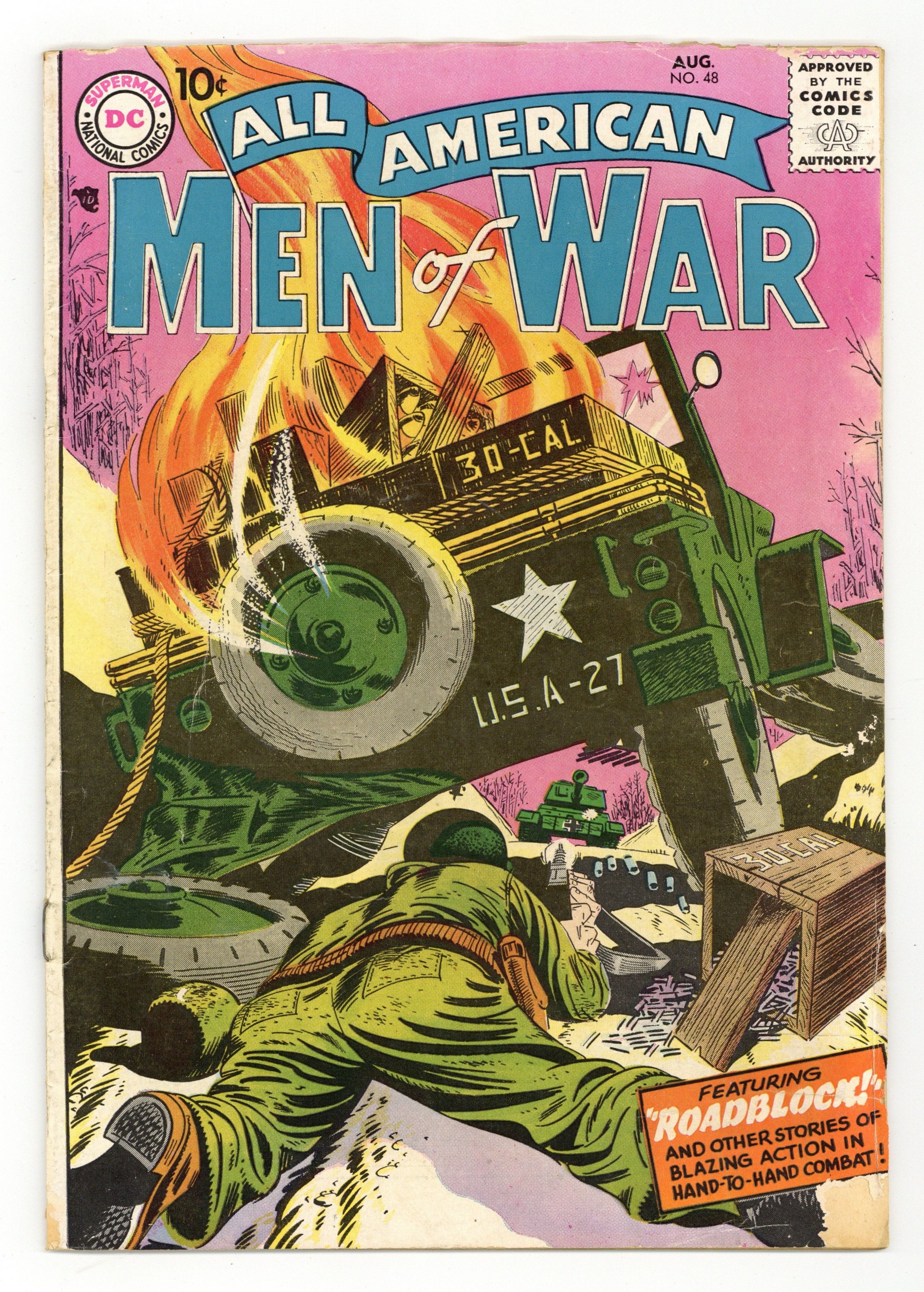 Edited by Whitney Ellsworth and Robert Kanigher. Cover by Jerry Grandenetti. Stories by Robert Kanigher, Joe Kubert, Julius Schwartz, Morris Waldinger, Tommy Nicolosi, Bob Haney, Mort Drucker, Henry Boltinoff, Jack Abel, Tom Nicolisi, Ed Herron, Ross Andru, and Mike Esposito. Adventure tales of war and the military, including some humor—go into combat with All American Men of War! 36 Pages, Full Color. Cover price $0.10.