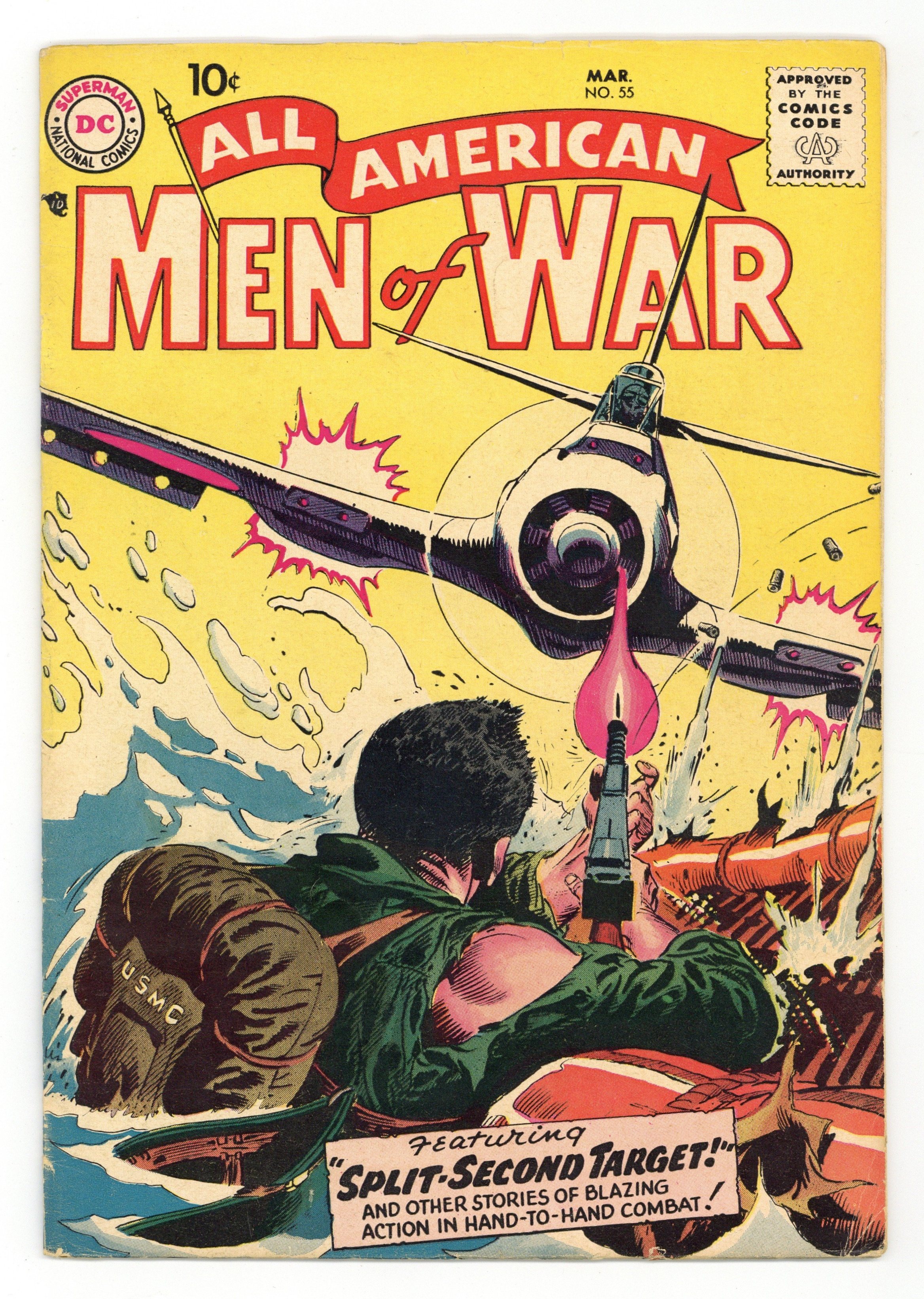 Edited by Whitney Ellsworth. Cover by Joe Kubert. Stories by Robert Kanigher, Joe Kubert, Morris Waldinger, Tom Nicolisi, Bob Haney, Russ Heath, and Jerry Grandenetti. Adventure tales of war and the military, including some humor—go into combat with All American Men of War! 36 Pages, Full Color. Cover price $0.10.