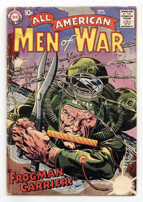 Edited by Whitney Ellsworth. Cover by Jerry Grandenetti. Stories by Robert Bernstein, Mort Drucker, Morris Waldinger, Tom Nicolisi, Bob Haney, Ross Andru, Mike Esposito, Robert Kanigher, Joe Kubert, and Henry Boltinoff. Adventure tales of war and the military, including some humor—go into combat with All American Men of War! 36 Pages, Full Color. Cover price $0.10.