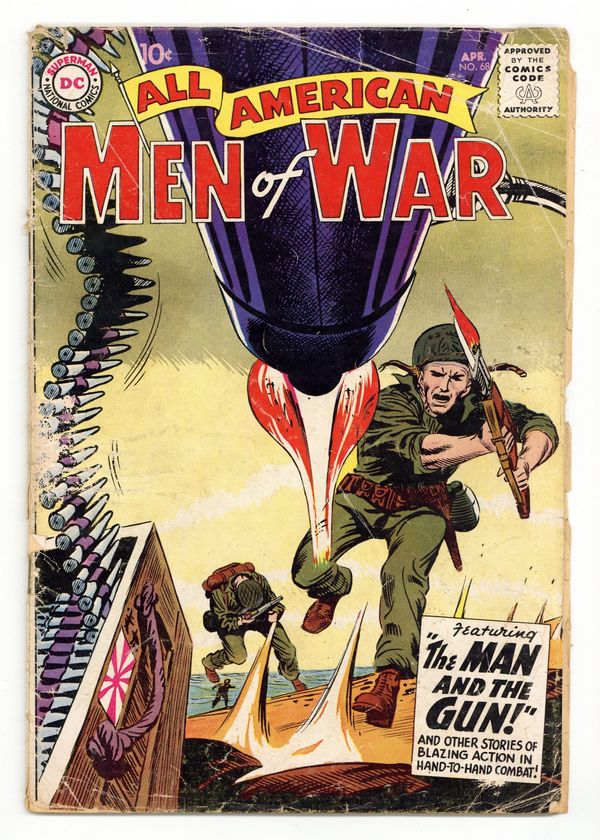 Edited by Robert Kanigher. Cover by Joe Kubert. Stories by Robert Kanigher, Jerry Grandenetti, Bob Haney, Mort Drucker, Irwin Hasen, Ed Herron, and Jack Abel. Adventure tales of war and the military, including some humor—go into combat with All American Men of War! Ad for The Brave and the Bold #23. 36 Pages, Full Color. Cover price $0.10.