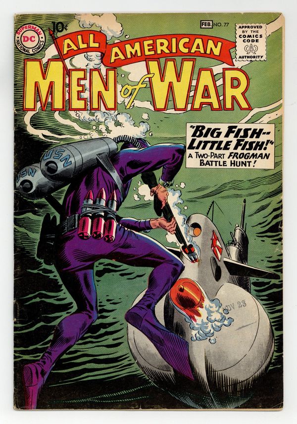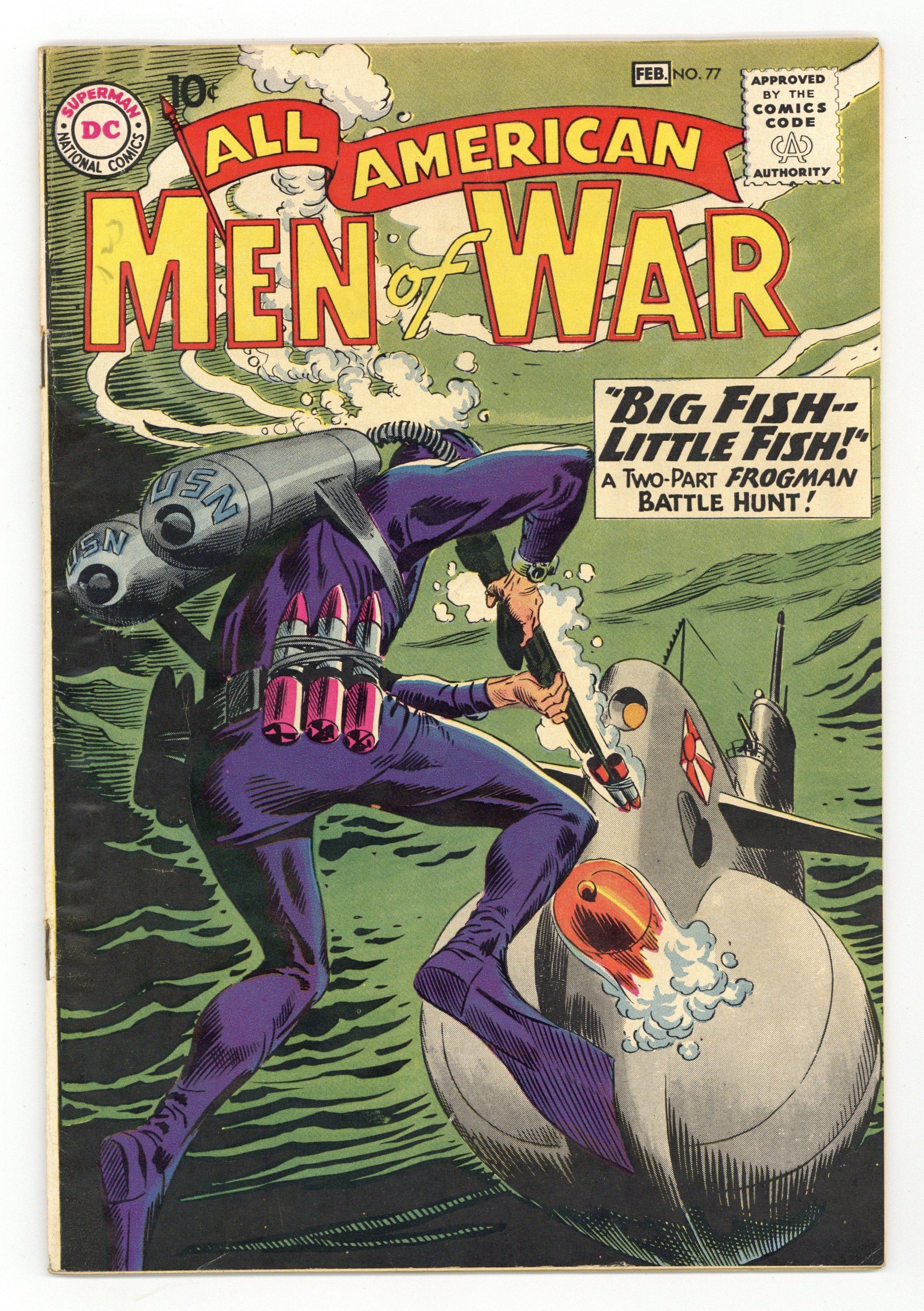 Edited by Robert Kanigher. Cover by Joe Kubert. Stories by Robert Kanigher, Irv Novick, Morris Waldinger, Tom Nicolisi, Bob Haney, Bill Everett, Hank Chapman, Mort Drucker. Adventure tales of war and the military, including some humor—go into combat with All American Men of War! 36 Pages, Full Color. Cover price $0.10.