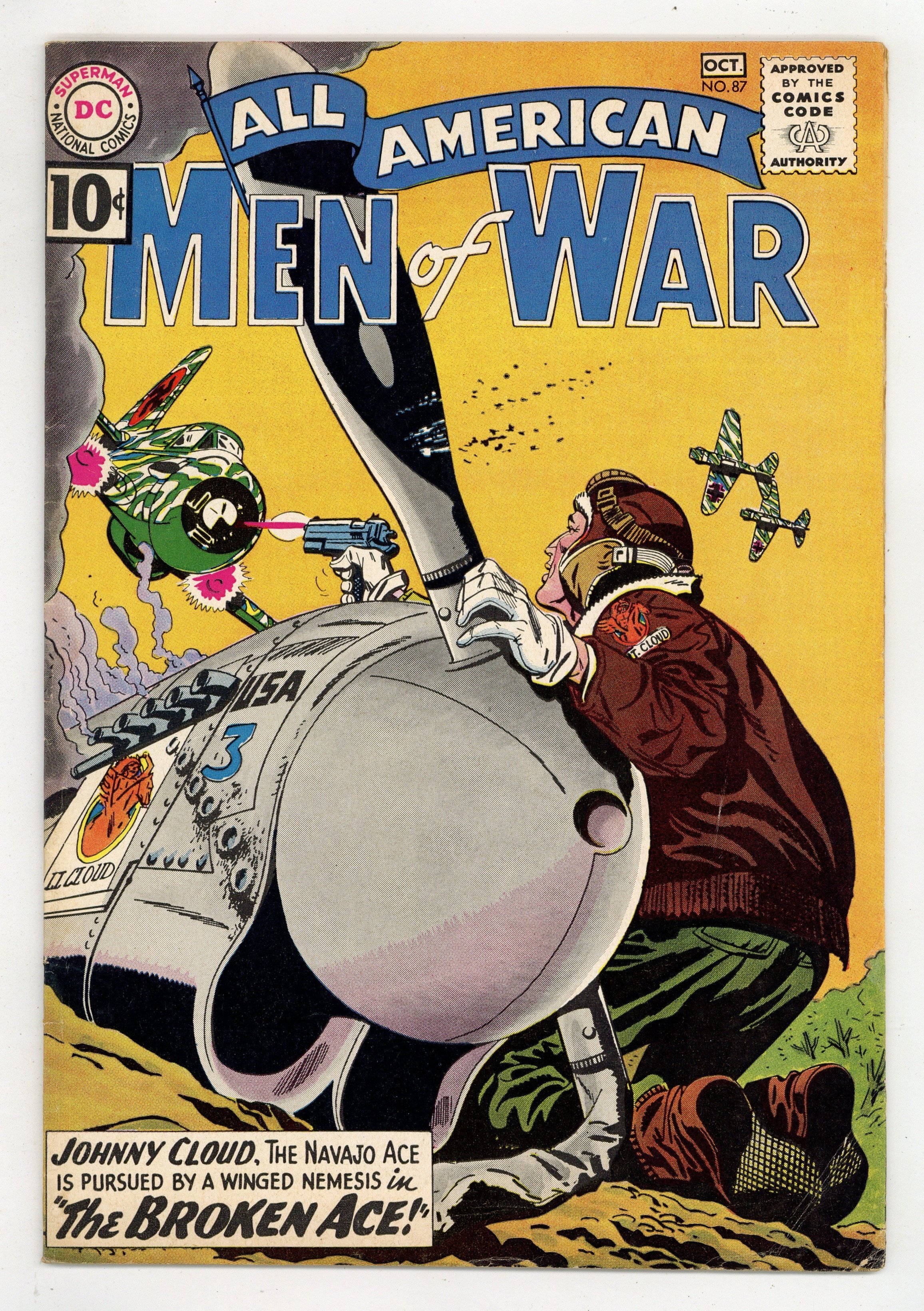 Edited by Robert Kanigher. Cover by Ross Andru and Jerry Grandenetti. Stories by Robert Kanigher, Irv Novick, Hank Chapman, Jack Abel, Morris Waldinger, and Tom Nicolisi. Adventure tales of war and the military, including some humor—go into combat with All American Men of War! Letter page art by Joe Kubert. 36 Pages, Full Color. Cover price $0.10.
