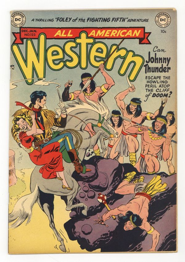 Cover art by Gil Kane. A short article about prospectors in the Old West. Johnny Thunder's Strange Rival, script by Robert Kanigher, pencils by Alex Toth, inks by Sy Barry; Circumstances force John Tane to invent a new alter ego and become his own rival. Ad for scenes from Disney's Alice in Wonderland, appearing on the backs of Royal Dessert boxes. The Buzzard of the Badlands featuring Overland Coach, pencils by Gil Kane, inks by John Giunta. Iroquois, the People of the Long House, script and art by Mort Drucker. An article about Navaho sand painting. Four-Footed Trooper starring Foley of the Fighting Fifth, script by John Broome, pencils by Carmine Infantino, inks by Sy Barry. 36 Pages, Full Color. Cover price $0.10.