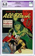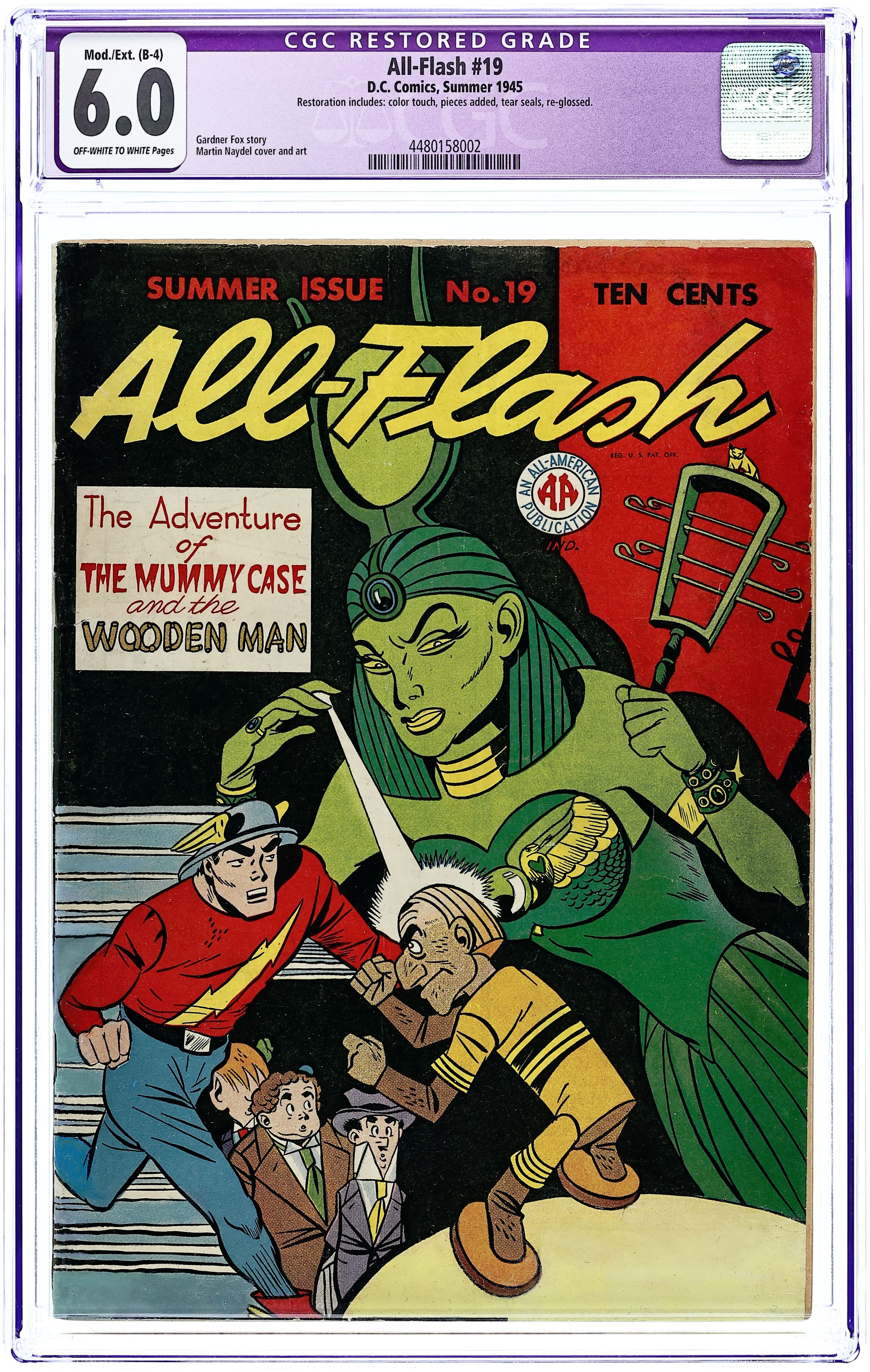 Written by Gardner F. Fox. Art and cover by Martin Naydel. The Three Dimwits accidently become involved in a shady rest home operation, and only the Flash can sort out the details in time to protect the innocent victims. A petty sneak thief robs the Garrick home of a seemingly worthless book, not realizing that it contains a map that will lead him and the Flash to the Andes Mountains in Chile to unravel the secret of a mysterious tapestry. Mutt and Jeff humor story by Al Smith (as Bud Fisher). 52 Pages, Full Color. Cover price $0.10.