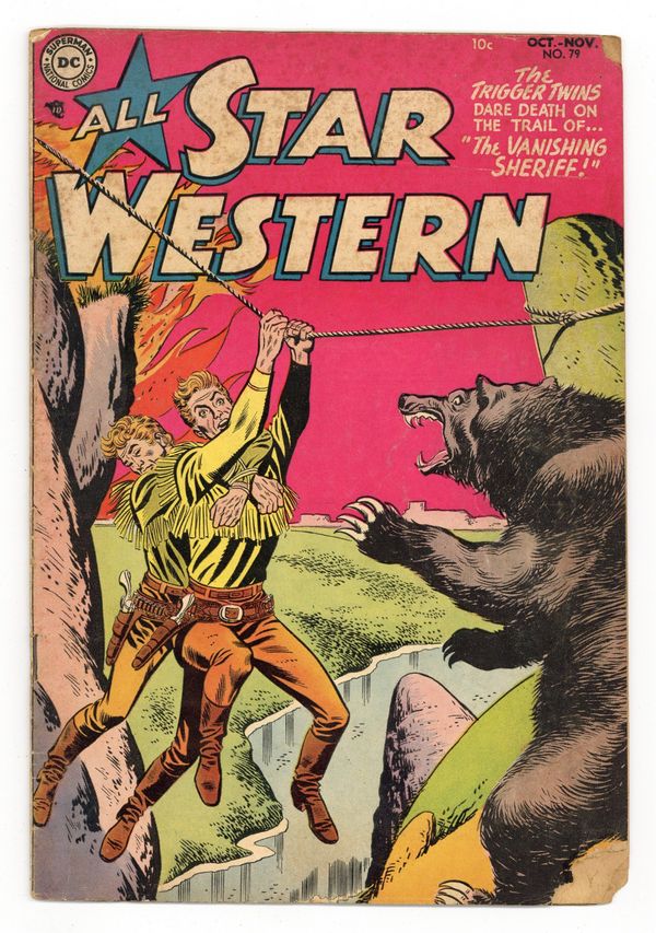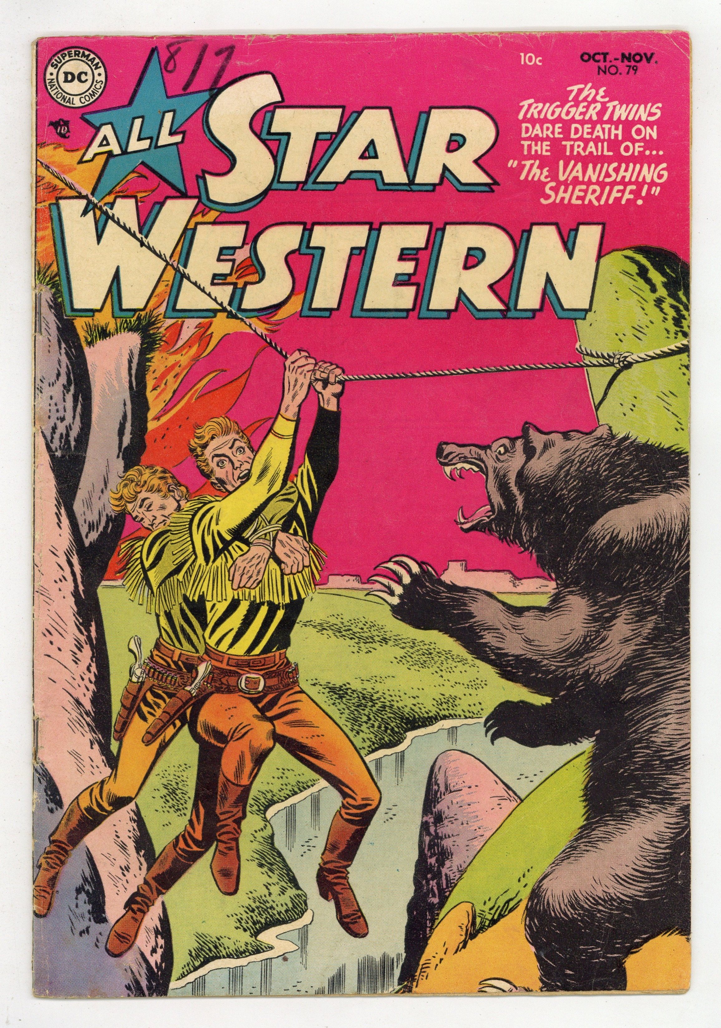 Edited by Julius Schwartz. Cover by Gil Kane and Bernard Sachs. Written by Lee Goldsmith, Robert Kanigher, Ed Herron, John Broome and Gardner Fox. Art by Gil Kane, Mort Drucker, Jerry Grandenetti, Howard Sherman, Jimmy Thompson, Joe Giella and Frank Giacoia. The Trigger Twins dare death on the trail of..."The Vanishing Sheriff!" by Lee Goldsmith, Gil Kane and Joe Giella. Also in this issue: Johnny Thunder in "The Secret Trail to Johnny Thunder!" by Robert Kanigher, Mort Drucker and Frank Giacoia; Strong Bow in "Terror of the Thunder Birds!" by Ed Herron and Jerry Grandenetti; Foley of the Fighting 5th in "The Painted Assassins of Apache Hill!" by John Broome and Howard Sherman; and "The Sun-Dance of the Crow Indians!" by Gardner Fox and Jimmy Thompson, reprinted from Jimmy Wakely (1949) #1. Plus: Bullseye Billy half-pager and 2-page article "The Tommy Knockers"! 32 pages, full color. Cover price $0.10.