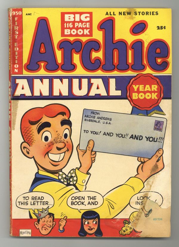 Published 1950 by Archie Publications.$140.00- 1" cumulative spine split. Tape inside cover. Water damage. Staple rust with migration. Mold.