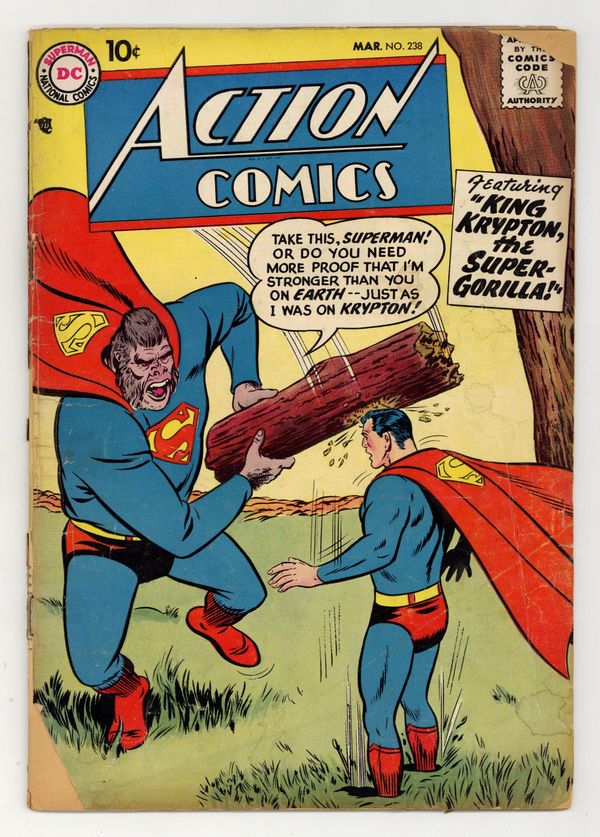 Cover pencils by Curt Swan, inks by Stan Kaye. "The Super-Gorilla from Krypton," script by Otto Binder, pencils by Wayne Boring, inks by Stan Kaye; Jimmy summons Superman to Africa with his signal-watch when he encounters a gorilla with super-powers; Superman deduces that the giant ape is from Krypton, and later it sacrifices itself to save Superman from Green Kryptonite, revealing that it was really a Kryptonian human accidentally transformed into a gorilla. Ad for Superman's Girl Friend Lois Lane. Supermen of America ad. One-page Ollie story by Henry Boltinoff. "Marooned in the Fourth Dimension," script by Otto Binder, art by Jim Mooney; Tommy Tomorrow checks out Prof. Jaxon's dimension cabinet, a gateway to the 4th dimension; Since Tommy suspects the cabinet is a hoax, he volunteers to test the device and is sent to the 4th dimension. One-page Casey the Cop story by Henry Boltinoff. "The Tenderfoot Hunter" starring Congo Bill, art by Howard Sherman. 36 Pages, Full Color. $.10 Cover price $0.10.
