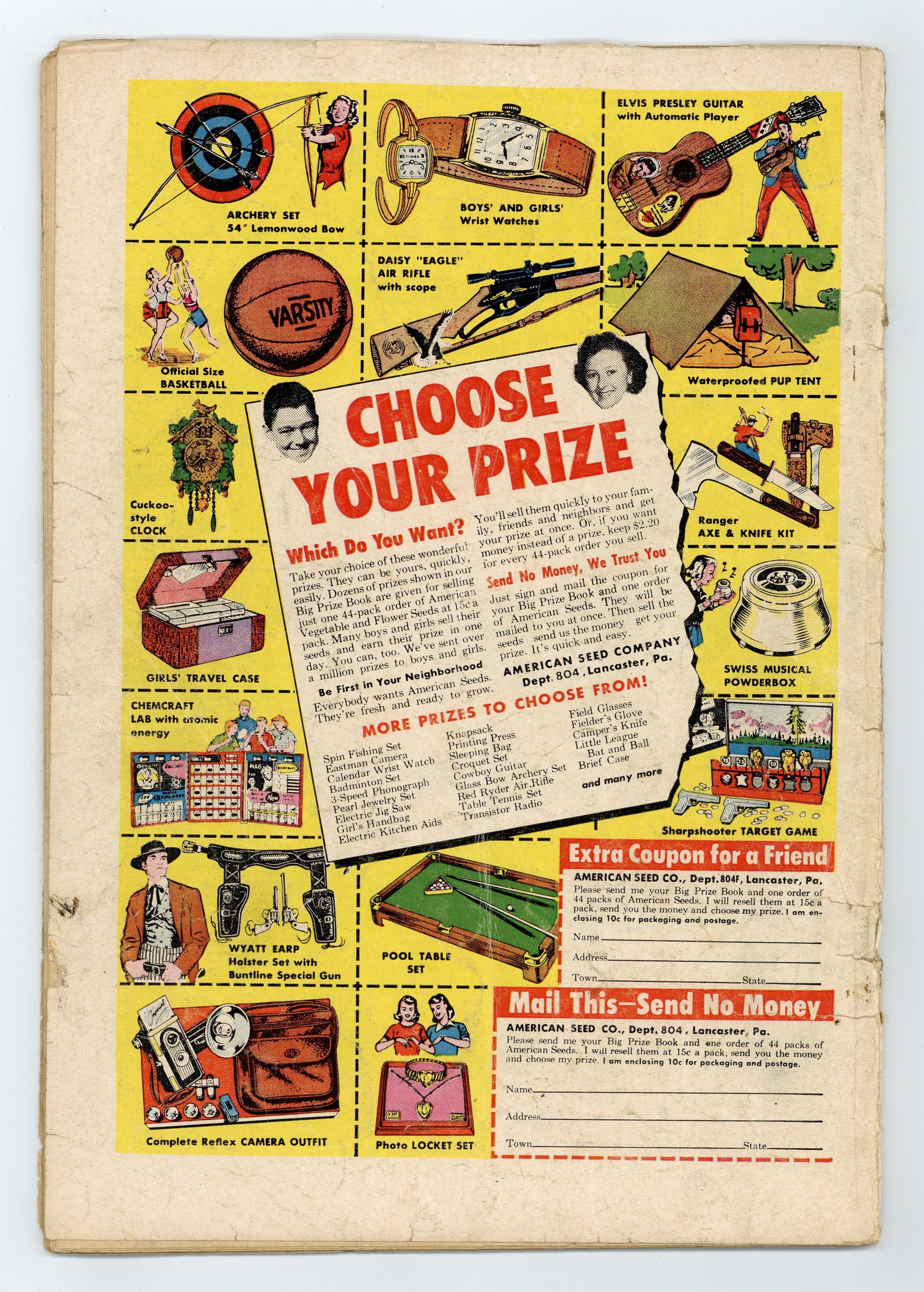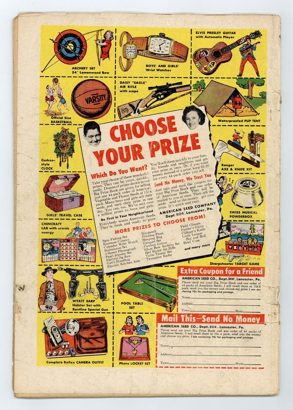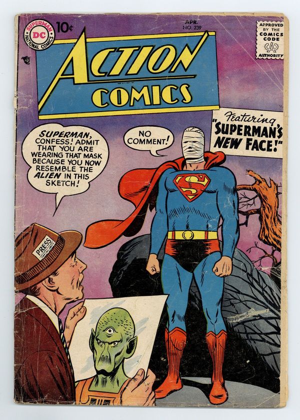 Cover pencils by Curt Swan, inks by Stan Kaye. "Superman's New Face," script by Edmond Hamilton, pencils by Wayne Boring, inks by Stan Kaye; Superman is caught in an atomic explosion and afterwards must bandage his face, or wear a lead mask, to keep anyone from seeing what happened to him. One-page Tricksy the World's Greatest Stunt Man story by Henry Boltinoff. "The Puzzle of the Jungle Pyramid!" starring Congo Bill, art by Howard Sherman. Untitled Jerry the Jitterbug story by Henry Boltinoff. Untitled Casey the Cop story by Henry Boltinoff. "The Toys That Stopped Space Crime" starring Tommy Tomorrow, script by Otto Binder, art by Jim Mooney. 36 Pages, Full Color. $.10 Cover price $0.10.
