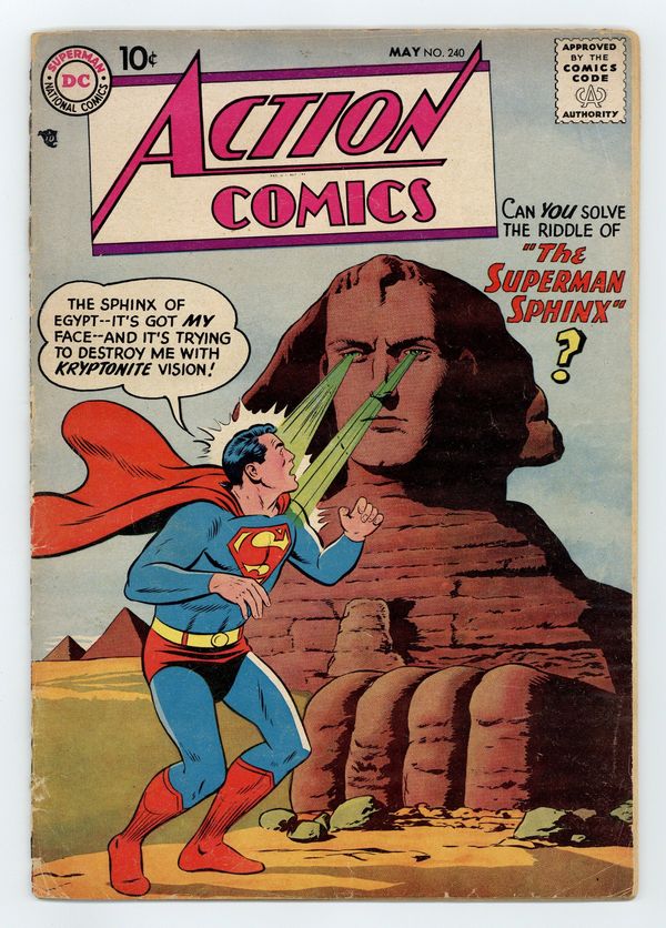 Cover pencils by Curt Swan, inks by Stan Kaye. "The Secret of the Superman Sphinx," script by Otto Binder, pencils by Wayne Boring, inks by Stan Kaye; Lois discovers a Clark Kent robot in a closet at the Daily Planet, and a strange Sphinx with a Superman head and kryptonite vision goes into orbit around the Earth. One-page Ollie story by Henry Boltinoff. "The Trial of Tommy Tomorrow," script by Otto Binder, art by Jim Mooney; Tommy is on trial for the murder of Brent Wood. One-page Animal Wonderland cartoon by Martin Naydel. "Trapped in the Insect World" starring Congo Bill, art by Howard Sherman. 36 Pages, Full Color. $.10 Cover price $0.10.