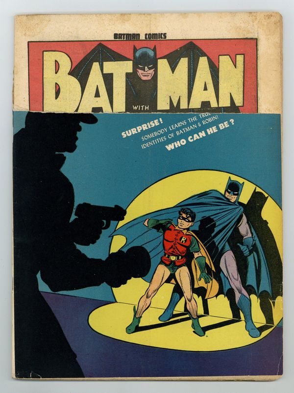 1st appearance of Alfred Pennyworth - Cover by Jerry Robinson. "The Joker Reforms!", script by Don Cameron, pencils by Bob Kane, inks by Jerry Robinson and George Roussos; After robbing a jewelry store, the Joker crash-lands his escape plane and loses his memory; He stumbles into a town where he becomes a hero... but not to the other members of his gang, who seek the jewels, and come looking for him, as do the Caped Crusaders. One-page Shorty story by Henry Boltinoff. "The Grade A Crimes!", script by Ruth "Bunny" Lyons Kaufman (as Bunny Lyons), pencils by Jack Burnley, inks by Jack Burnley and Ray Burnley (backgrounds); After a series of early-bird robberies, Batman notes the appearances of a milkman and his horse-drawn wagon at the scene of every crime, and makes the connection that it is involved in the heists. "The Adventure of the Branded Tree!", script by Don Cameron, pencils by Jack Burnley, inks by Jack Burnley and Ray Burnley (backgrounds); Batman and Robin track down the secret of a dagger-branded tree that led to the murder of two lumberjacks. "Motive" text story by Eric Carter. One-page Clancy the Cop story by Henry Boltinoff. "Here Comes Alfred!", script by Don Cameron, pencils by Bob Kane, inks by Jerry Robinson and George Roussos (backgrounds); Things get very complicated when an English butler, named Alfred, suddenly shows up on the doorstep of Wayne Manor and announces that he is there is attend to their needs in order to fulfill a promise that he made to the original butler for the Wayne family. 68 Pages, Full Color. Cover price $0.10.