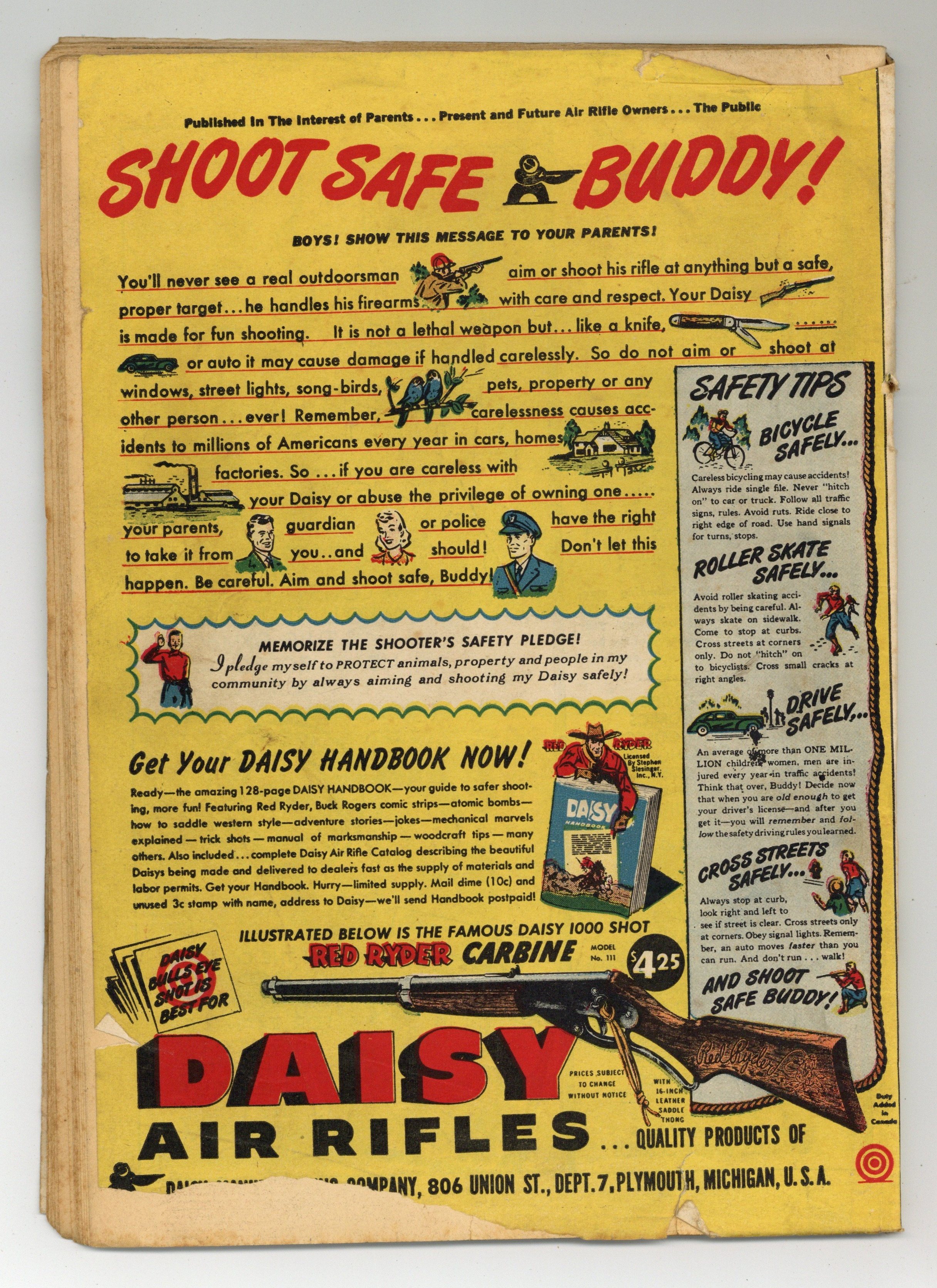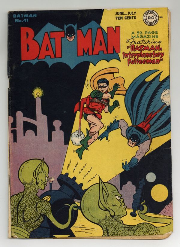 Cover art by Jim Mooney. "The Bird Cage Bandits!", art by Jim Mooney; Penguin is released from prison and he pretends to go straight by opening a bird store and giving away special birds to important people; Batman is suspicious of Penguin's activities and he decides to check upon the gifted birds; Soon, Batman and Robin discover that Penguin is using the bird cages he provided to carry bombs and other devices. Wheaties ad featuring Jerry Witte. "The Bandits of Tiny Town!", art by Jim Mooney; Some thugs from Gotham City are raiding and stealing Midget Town, a city populated by small people; Batman and Robin learn of the unfortunate events and they travel to the neighboring town to help out. Casey the Cop half-page by Henry Boltinoff. "The Score" text story by Bob Baker. "Batman, Interplanetary Policeman!", art by Jim Mooney; A Martian citizen has come to Earth to ask the assistance of Batman and Robin in order to defeat a vile emperor called Sax Gola; Batman and Robin are glad to help and they travel to Mars on the Martian's spaceship. Little Arthur one-page story by Phil Berube. 52 Pages, Full Color. Cover price $0.10.