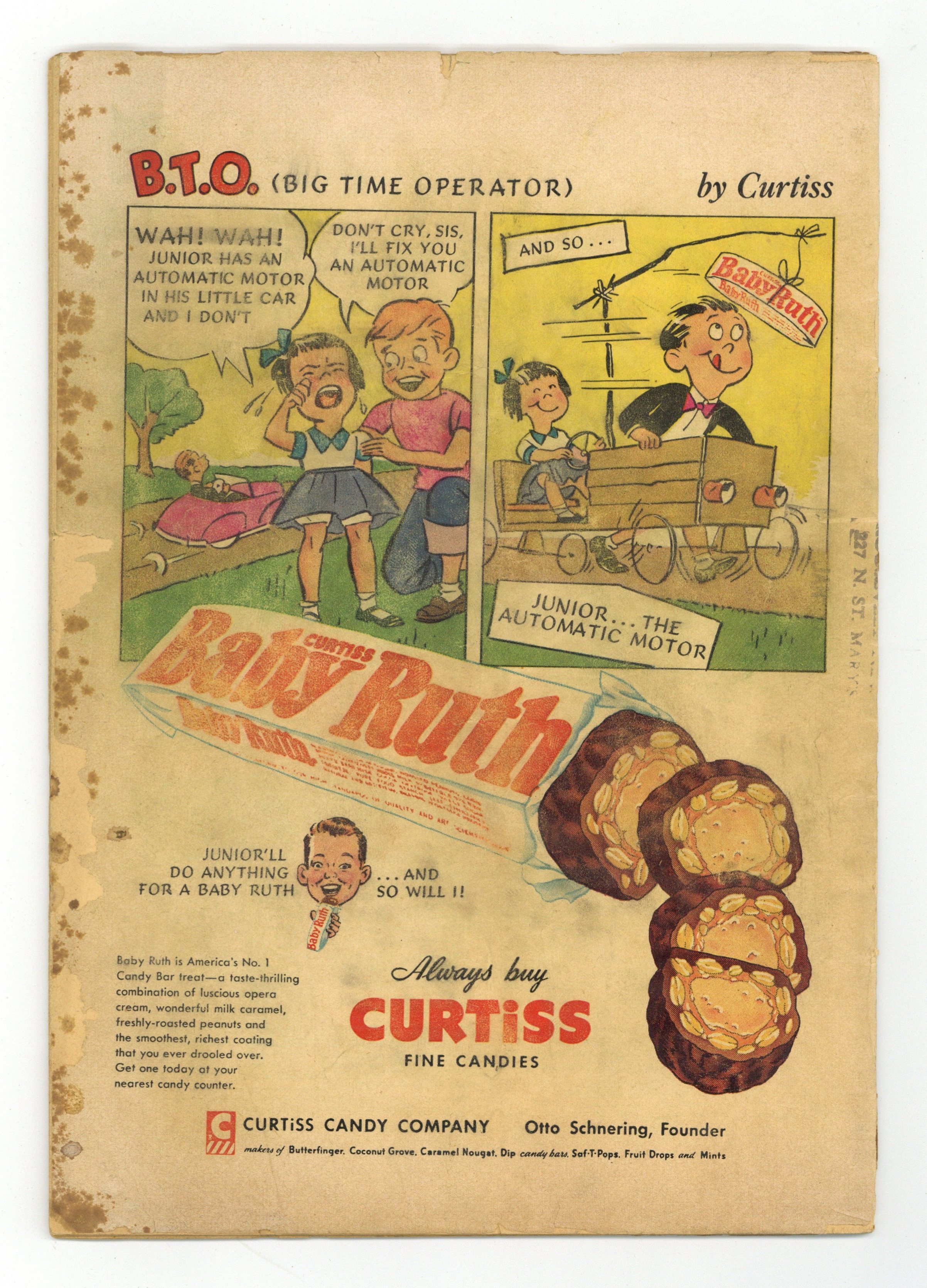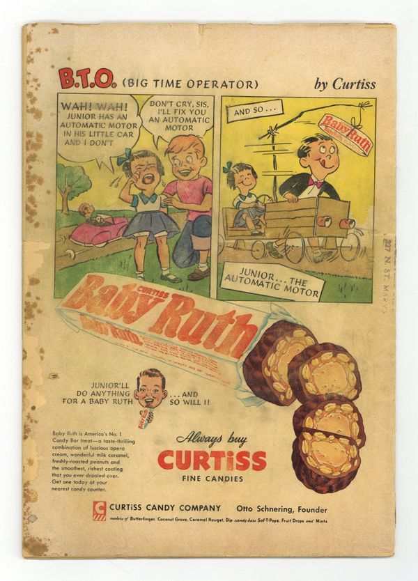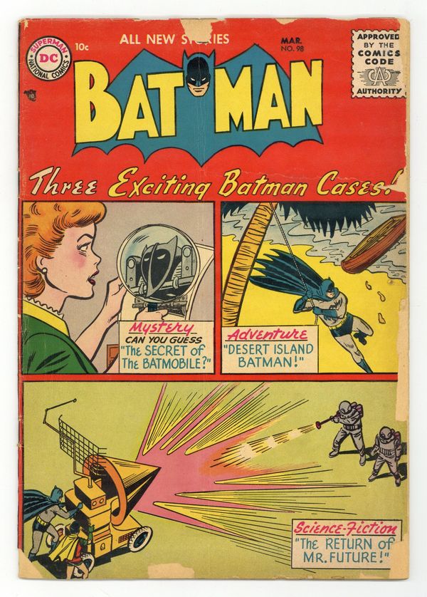 Cover by Win Mortimer. "The Return of Mister Future," script by Arnold Drake (pages 1-7, first Drake story for DC) and Bill Finger (pages 7-8), pencils by Dick Sprang, inks by Charles Paris; Crooks steal a secret weapon created by author Jules Verne, so the Capred Crusaders travel back in time, bring Verne back to the present, and have him design a counter weapon that will nullify his deadly weapon. 2/3-page Casey the Cop story by Henry Boltinoff. Healthy Teeth for You and Your Pet! public service announcement with Buzzy, script by Jack Schiff, art by Win Mortimer. "The Desert Island Batman," script by Edmond Hamilton, pencils by Sheldon Moldoff, inks by Charles Paris; Bruce takes a cruise on a yacht populated by millionaires because he suspects something will happen, and it does when a gang hijacks the ship and holds the millionaires captive on an island. One-page Casey the Cop story by Henry Boltinoff. Patrolman with Six Legs article by Joe Mallory. "Secret of the Batmobile," script by Bill Finger, pencils by Sheldon Moldoff, inks by Charles Paris; Vicki Vale unwittingly discovers the true identity of the Batman without knowing it when she takes a photo of the Batmobile after it's engine was damaged. 36 Pages, Full Color. Cover price $0.10.