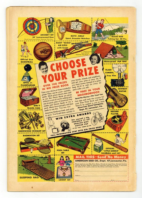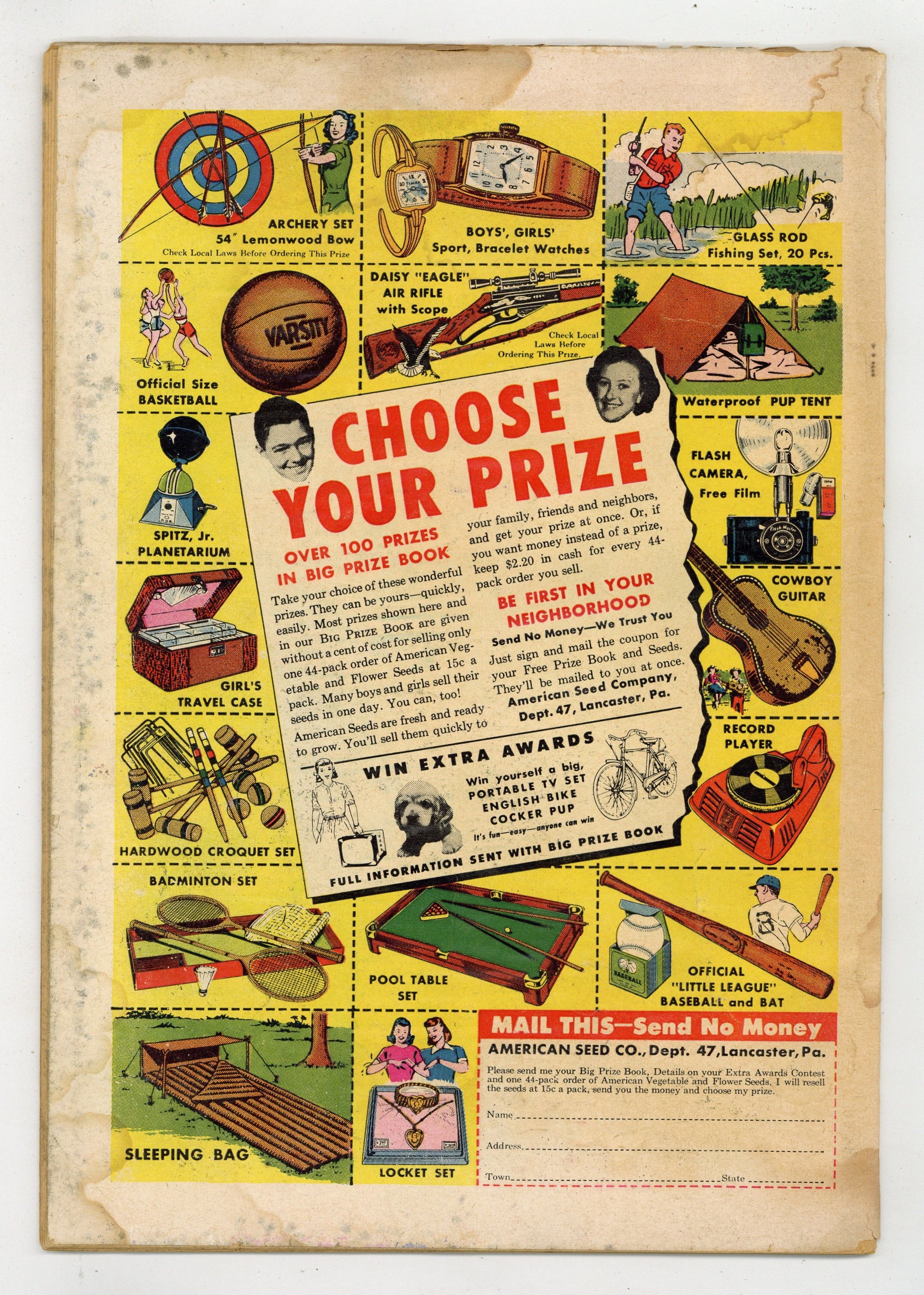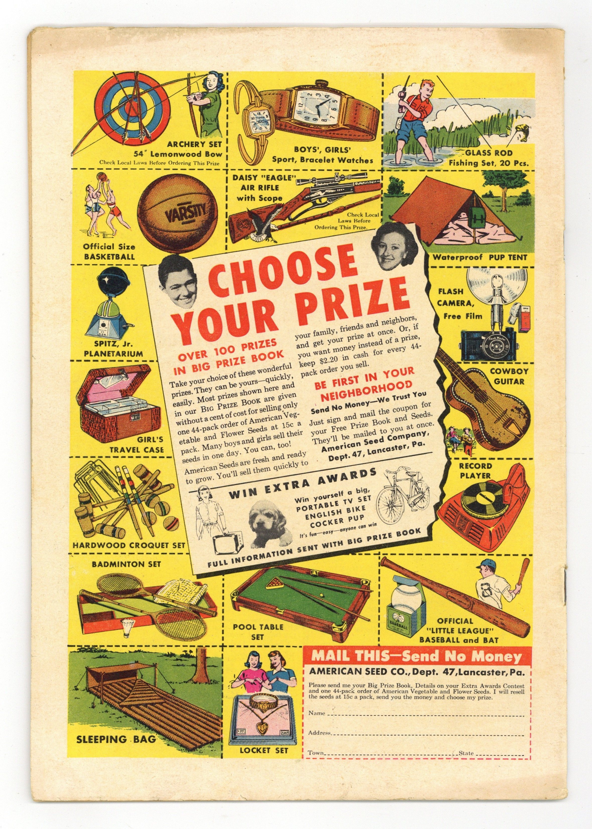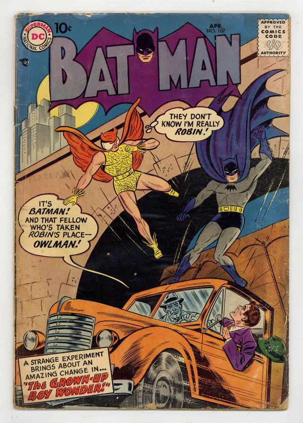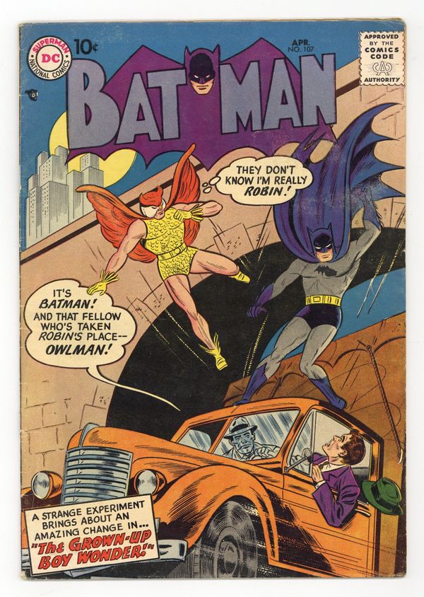 Cover by Sheldon Moldoff. "The Boy Who Adopted Batman," pencils by Sheldon Moldoff, inks by Charles Paris; Danny Benson, a boy without a father, often talked to the Batman statue in the park; One day, he tells the statue about a gang of crooks and eventually he assists in the round-up of the criminals. Careers in Nursing public service announcement with Buzzy, art by Ruben Moreira. One-page Warden Willis story by Henry Boltinoff. "Robin Falls in Love," script by Bill Finger, pencils by Sheldon Moldoff (as Bob Kane), inks by Charles Paris; Robin falls hard for a lovely young skater after saving her life....a romance that causes problems for Batman in their daily crime fighting chores! "Foiling the Getaways" text story. 2/3-page Casey the Cop story by Henry Boltinoff. "The Grown-Up Boy Wonder," script by Bill Finger, pencils by Sheldon Moldoff (as Bob Kane), inks by Stan Kaye; While examining a lead-lined box Superman had brought back from outer space, Dick accidentally touches a release, emitting a gas that causes him to grow bodily into manhood, thus forcing him to give up his Robin persona and adopting a different crime fighting ID. 36 Pages, Full Color. Cover price $0.10.
