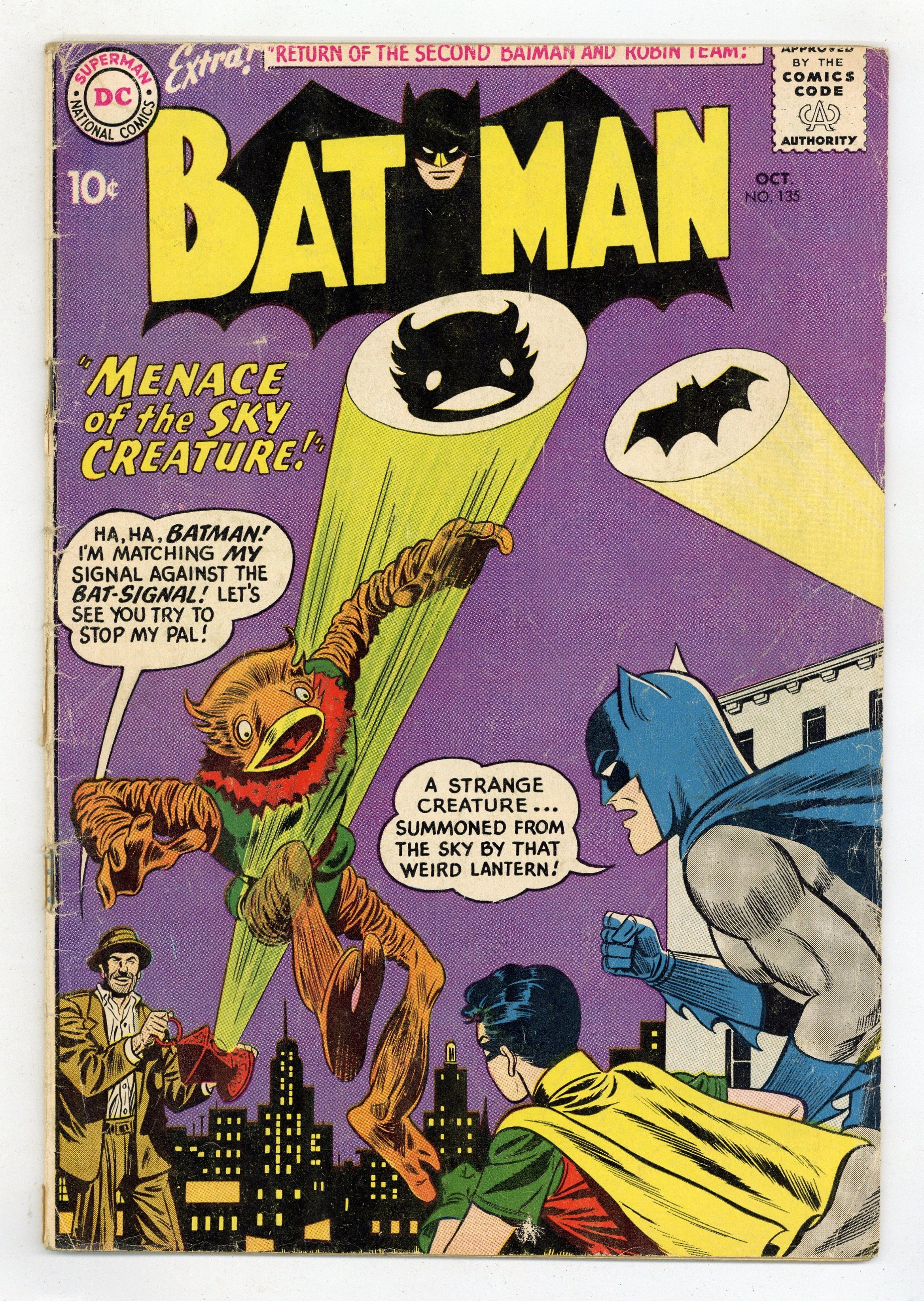 Cover pencils by Dick Dillin and Sheldon Moldoff, inks by Sheldon Moldoff. "Crimes of the Wheel," script by Bill Finger, pencils by Sheldon Moldoff, inks by Charles Paris; The Dynamic Duo break up a gambling ring headed by "Wheels" Foster, but he manages to escape and threatens to kill the Caped Crusaders with a giant roulette wheel and its giant steel ball. How Are Your Shopping Manners? public service announcement, art by Bernard Baily. "The Return of the Second Batman and Robin Team," script by Bill Finger, art by Sheldon Moldoff; Batman's old foe, John Crandall, is released from jail and vows to destroy anything that is a monument to the Caped Crusader, and begins by captured the new Batman and Robin team. "The Menace of the Sky Creature," script by Bill Finger, pencils by Sheldon Moldoff, inks by Charles Paris; Two crooks come into possession of a sorcerer's lantern that can summon a mysterious sky creature and they use that being to battle the Caped Crusaders. One-page Warden Willis story by Henry Boltinoff. Full-page ad for Justice League of America # 1. 36 Pages, Full Color. Cover price $0.10.