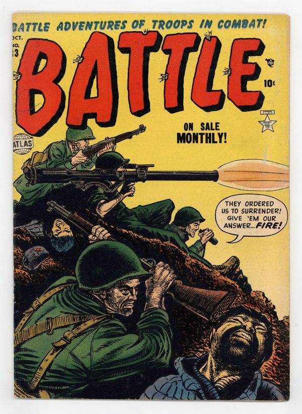 "Surrender, Hell" (art by Russ Heath), "Troop Movement" (script by Stan Lee, art by Cal Massey), "Surprise Attack" (art by Norman Steinberg), "Barbed Wire" (art by Gil Evans), and a two-page text story, "The Deadliest Enemy." Cover price $0.10.
