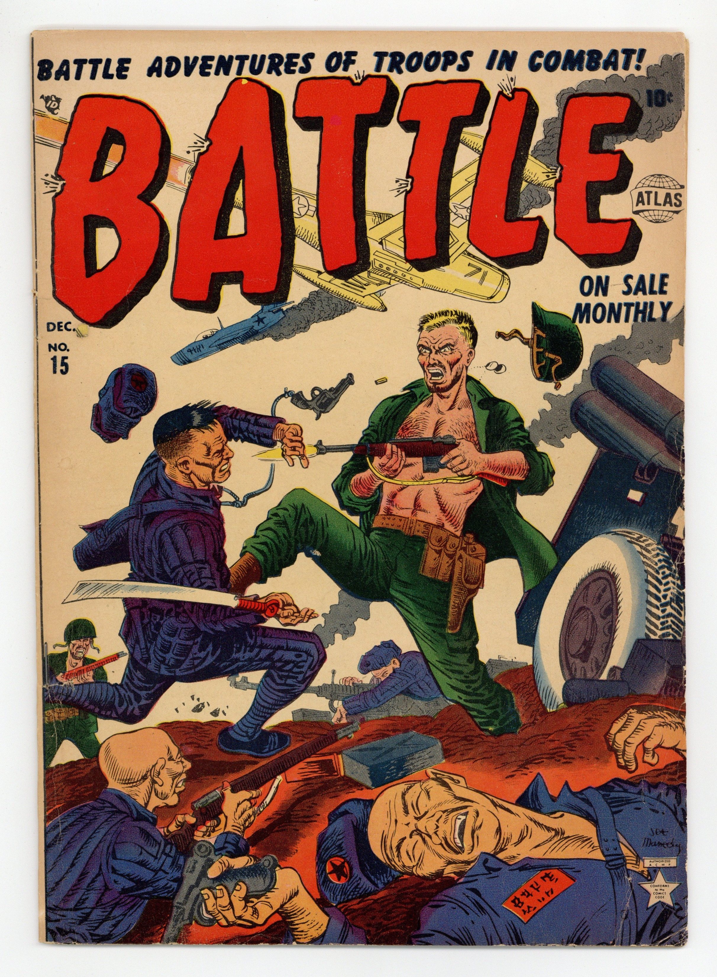 Cover art by Joe Maneely. The Reds Attack. Report from Korea text story by Lt. Jeremiah A. O'Leary. Death in the Dust, art by George Tuska. Firing Pin! Over the Mountain, art by Dave Berg. 32 pgs. $0.10. Cover price $0.10.
