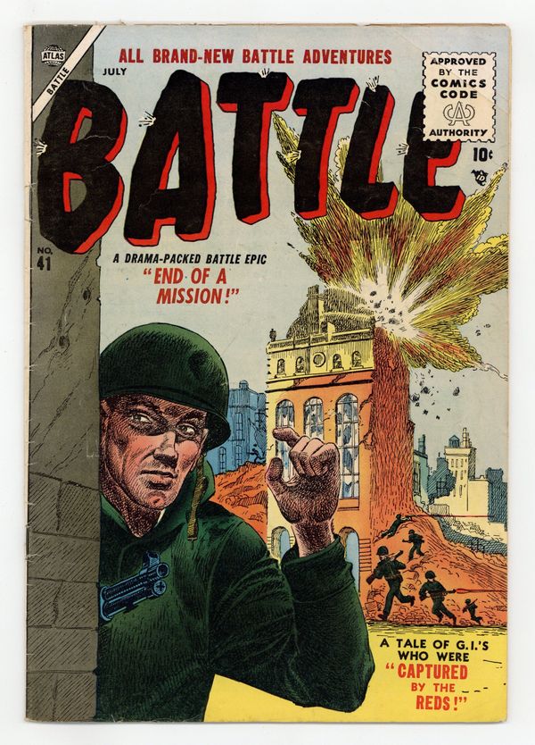 $90.00"Captured By the Reds!" (pencils by Joe Kubert, inks by Seymour Moskowitz), "Mortar Fire!" (art by Bill Bernulis), "Surrounded," "End of a Mission" (art by Gene Colan), and a two-page text story, "G.I. Holiday." Cover price $0.10.