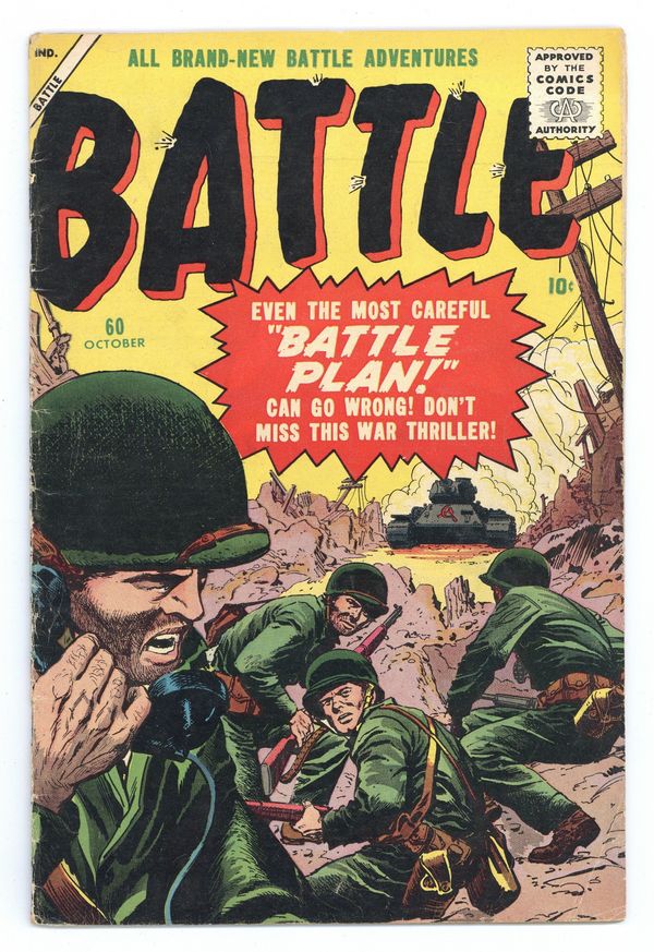 "Battle Plan!" (art by Dave Berg), "The Man Who Beat the Hun," "First in the Fight" (art by Jay Scott Pike), Cookie's Combat Tales in "Fightin' Mad!" (art by Berg), "D-Day Minus 1" (art by Joe Orlando?), and a two-page text story, "Bombardment." Combat Kelly appearance. Cover price $0.10.