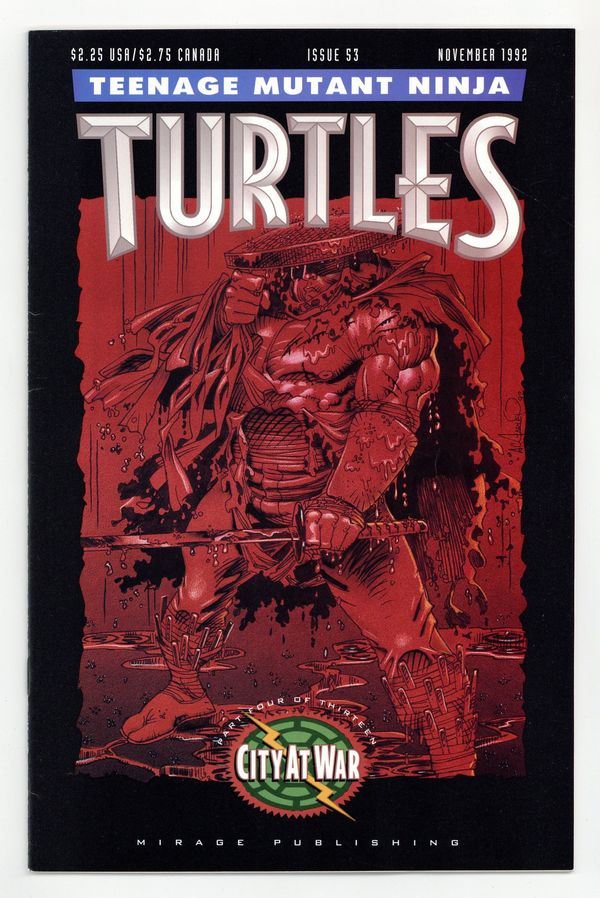 Published Nov 1992 by Mirage Studios.$40.00City At War, Part 4. Just when it cant get any worse, Shredder returns. Story, art and cover by Kevin Eastman and Peter Laird. Story by Kevin Eastman, Peter Laird and Jim Lawson; art by Lawson. Black and white; 32 pages. Cover by A.C. Farley. Cover price $2.25. Cover price $2.25.