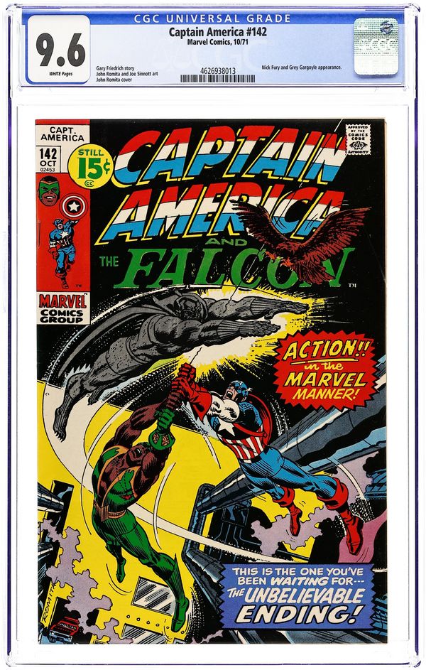 "And in the End..." Part 4 of 4. Guest-starring Nick Fury. Script by Gary Friedrich. Pencils by John Romita Sr. Inks by Joe Sinnott. Cover by John Romita Sr. Within SHIELD's mountaintop laboratory, the Grey Gargoyle is on the brink of victory! He's broken through the facility's defenses andgrabbed the canister of Element X -- the most dangerous substance on the planet. However the good guys have not given up. With his friends freed from their stone prisons, Captain America leads an all-out assault on the SHIELD lab! Can Cap and the Falcon -- plus Redwing, Nick Fury, and Sharon Carter -- dash the gargoyle's dream of global domination? What a blast (into outer space)! Cameo appearance by Leila Taylor. Last 15¢ cover price. (Notes: The Grey Gargoyle returns in Marvel Team-Up #13 to faceCaptain America again (and Spider-Man). This four-part story was reprinted in 2015 in the Captain America Omnibus #2. The hardcover collects issues 114 thru 148.) 36 pages. Cover price $0.15.