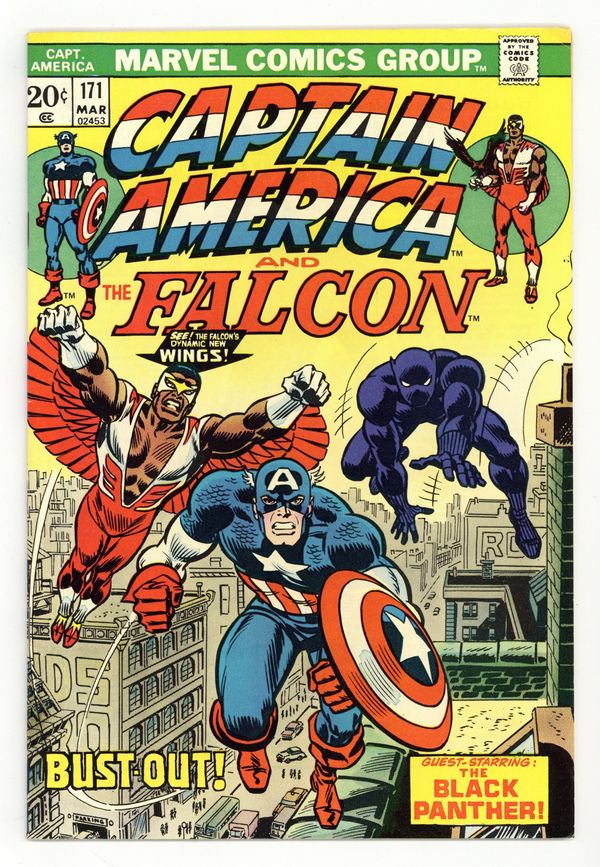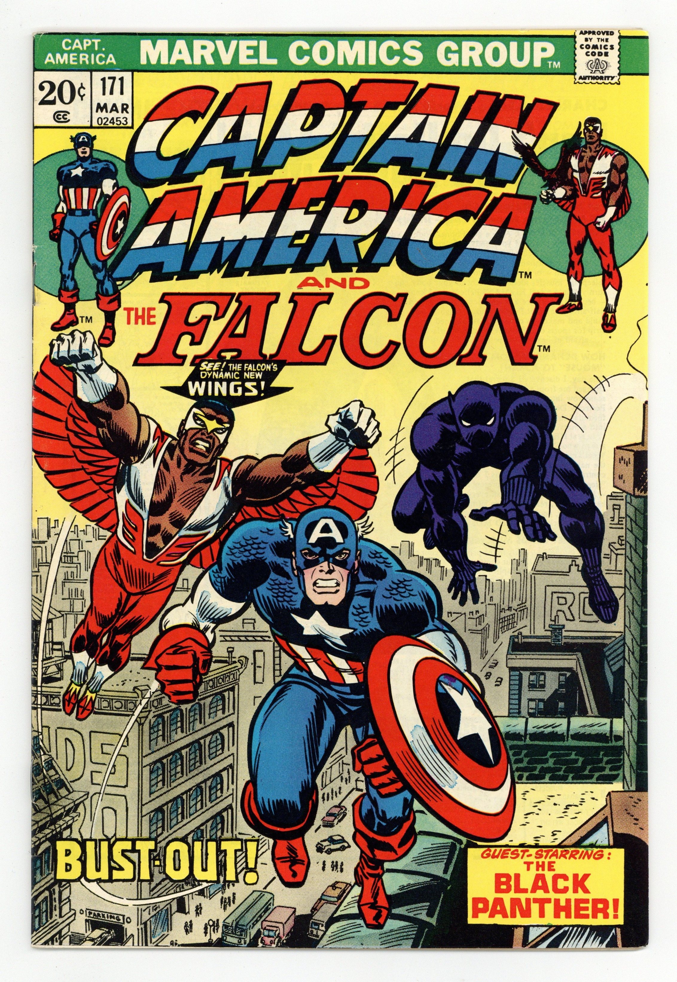 "Bust-Out!" Guest-starring the Black Panther. Plot by Steve Englehart. Script by Mike Friedrich. Pencils by Sal Buscema. Inks by Vince Colletta. Cover by John Romita Sr. and Tony Mortellaro. In Lagos, Nigeria, the Black Panther and the Falcon are hot on the trial of Stoneface! The former Harlem crime lord has kidnapped Leila Taylor, and needless to say...the newly winged Falcon wants her back! Meanwhile in New York, the Sentinel of Liberty is lying low after escaping from jail. But Cap needs his partner toreturn from Africa soon, because Moonstone is gunning for him! And Moonstone is very tough to beat! Cameo appearance by Iron Man. (Notes: Stoneface returns in Marvel Team-Up 114. The letters page contains Marvel Value Stamp series A #50 Black Panther by Rich Buckler and Frank Giacoia.) 36 pages. Cover price $0.20.