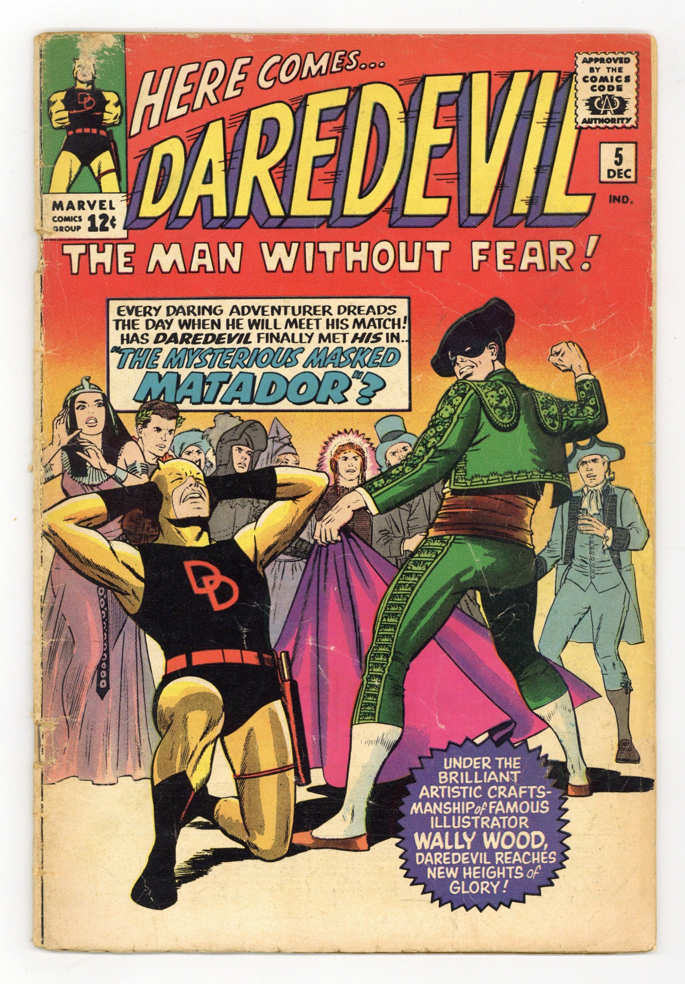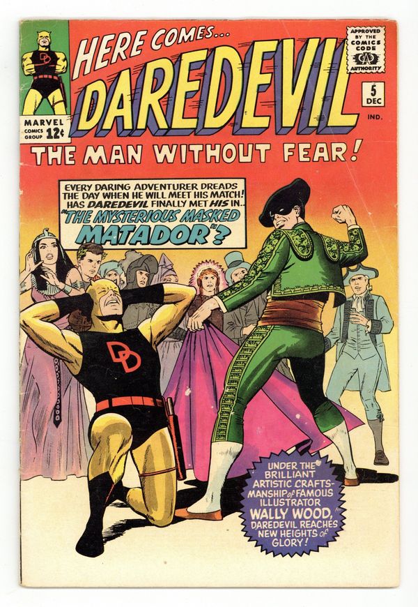 Cover pencils by Jack Kirby, inks by Wally Wood. First appearance of the Matador in The Mysterious Masked Matador!, script by Stan Lee, art by Wally Wood [as Wallace Wood]; A disgraced matador turns criminal to have his revenge on humanity; Daredevil stops the criminal's incessant cape waving. Daredevil's costume now has "DD" instead of just a "D." Daredevil pin-up (Wood art, though the buildings look like they were penciled by Jack Kirby). 36 pgs. Cover price $0.12. Cover price $0.12.