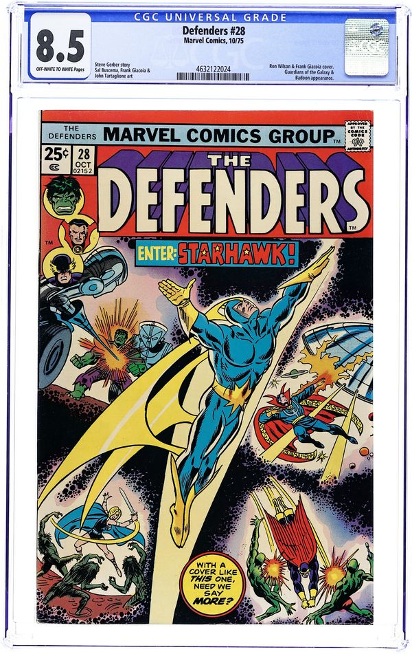 $13.50Cover pencils by Ron Wilson, inks by Frank Giacoia. First full appearance of Starhawk in My Mother, The Badoon!, script by Steve Gerber, pencils by Sal Buscema (layouts/breakdowns), Frank Giacoia (Finished Art), and John Tartaglione [as John Tartag] (Finished Art), inks by Frank Giacoia and John Tartaglione [as John Tartag]; Nighthawk, Charlie-27 and Martinex are captured by the Badoon; Starhawk helps Vance Astro and Valkyrie return to Earth; Hulk and Yondu are forced to enter the Super-Death Sweepstakes. 36 pgs. $0.25. Cover price $0.25.