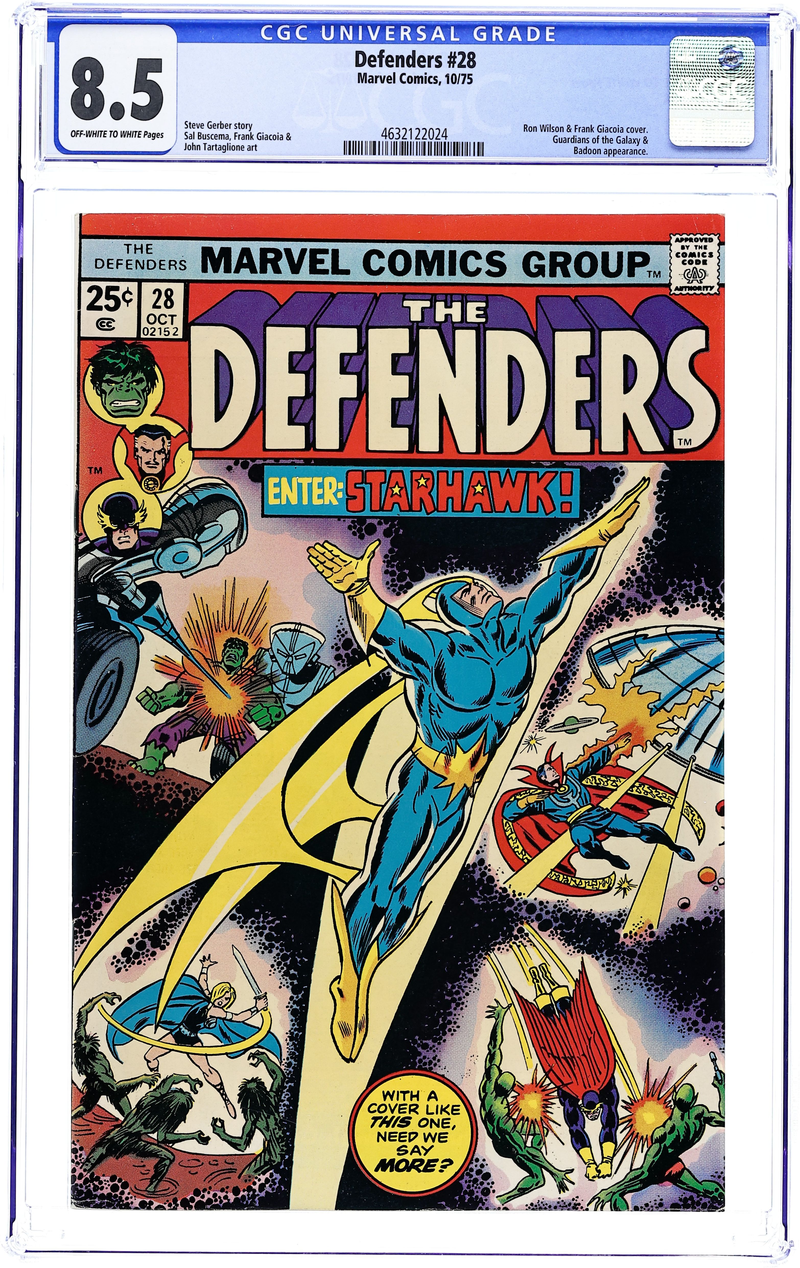 $32.00Cover pencils by Ron Wilson, inks by Frank Giacoia. First full appearance of Starhawk in My Mother, The Badoon!, script by Steve Gerber, pencils by Sal Buscema (layouts/breakdowns), Frank Giacoia (Finished Art), and John Tartaglione [as John Tartag] (Finished Art), inks by Frank Giacoia and John Tartaglione [as John Tartag]; Nighthawk, Charlie-27 and Martinex are captured by the Badoon; Starhawk helps Vance Astro and Valkyrie return to Earth; Hulk and Yondu are forced to enter the Super-Death Sweepstakes. 36 pgs. $0.25. Cover price $0.25.