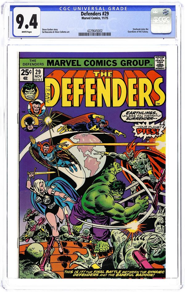 Here it is--the final battle between the Defenders and the Badoon in "Let My Planet Go!" Script by Steve Gerber, pencils by Sal Buscema, inks by Vince Colletta. Starhawk joins the Guardians of the Galaxy. Letter to the editor from comics writer Ralph Macchio. The Hulk stars in a one-page Hostess ad, "The Twins of Evil!" 40 pgs. Cover price $0.25.