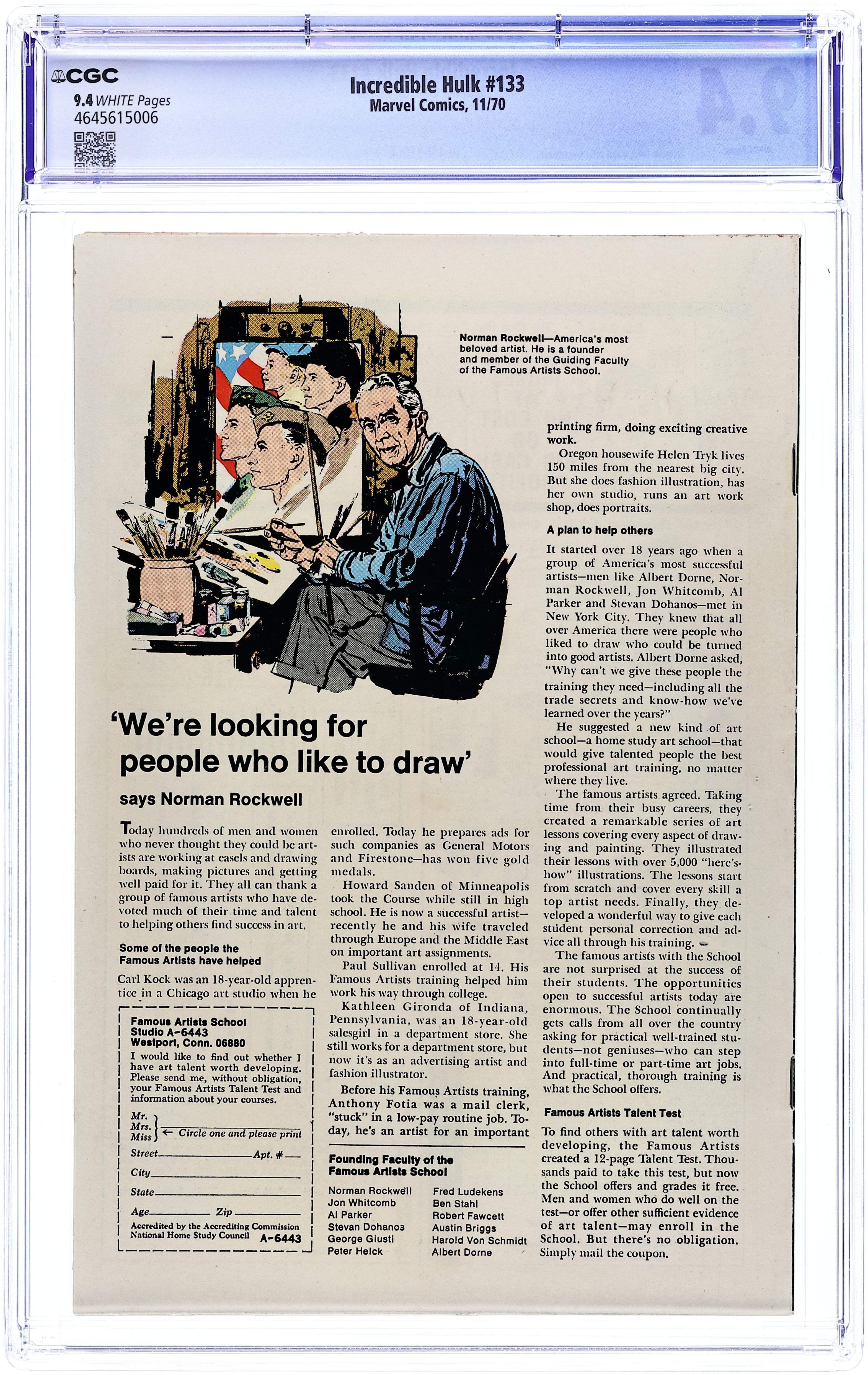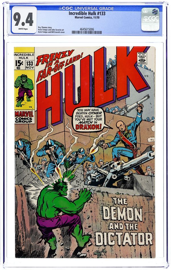 Cover pencils by Herb Trimpe, inks by Bill Everett. Day of Thunder--Night of Death!, script by Roy Thomas, pencils by Herb Trimpe, inks by John Severin; Hulk tries to help a dying Jim but turns the boy over to Ross in the hopes that his friend can be saved; Hulk mails himself to the country of Morvania where he comes into conflict with the brutal dictator Draxon. 36 pgs. $0.15. Cover price $0.15.