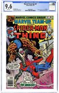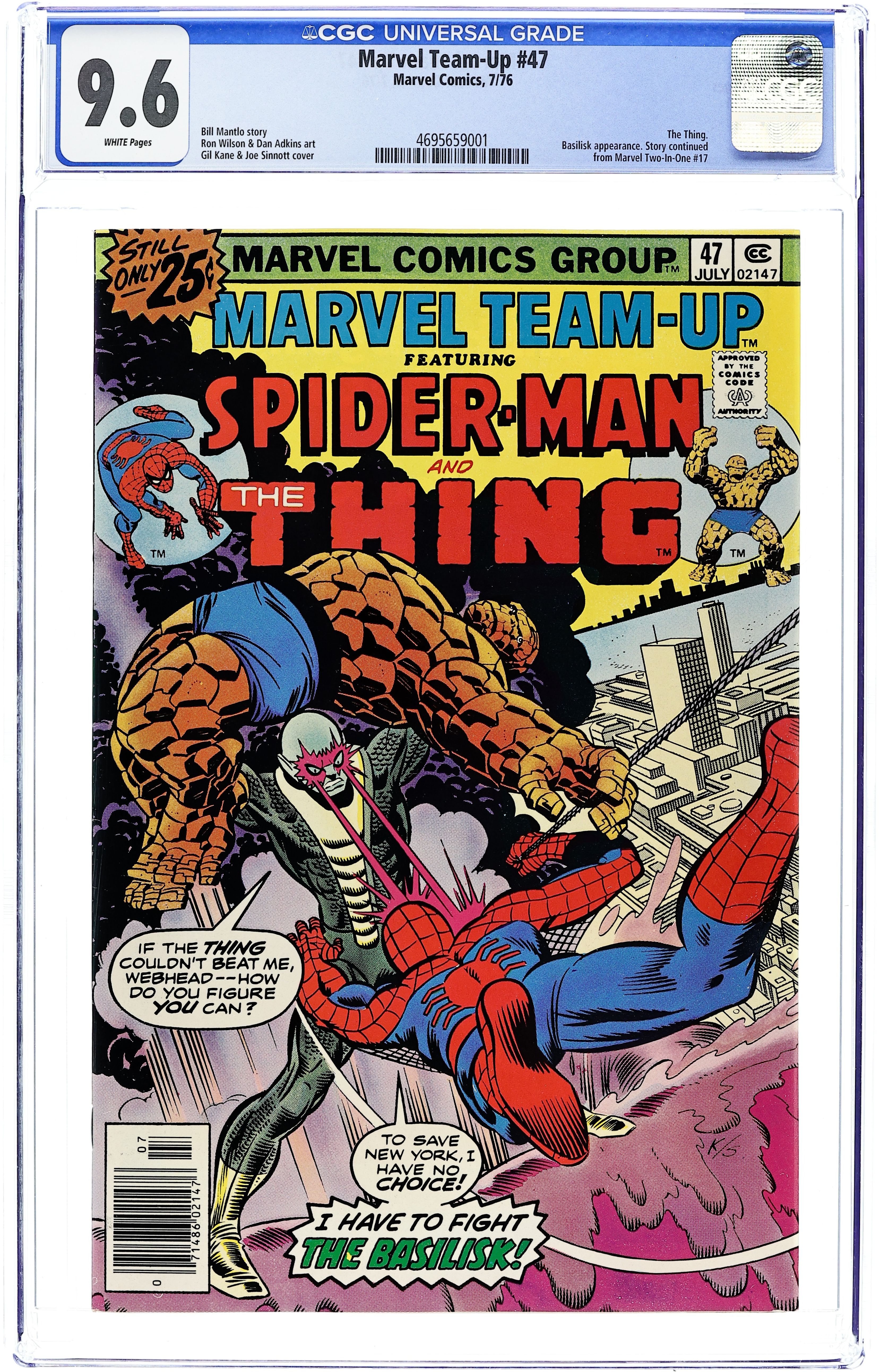 "I Have to Fight the Basilisk!" Part 2 of 2. Guest-starring Spider-Man and the Thing. Script by Bill Mantlo. Pencils by Ron Wilson. Inks by Dan Adkins. Cover by Gil Kane and Joe Sinnott. Story continues from Marvel Two-in-One 17 (Part 1). The stars of Marvel's team-up titles fight together against the Basilisk! The power-crazed Basilisk has raised a volcano in the middle of the Hudson River and now stands poised to destroy New York! The Thing and Spider-Man have already been beaten once by the Basilisk, but now the blue-eyed idol of millions and the wondrous wall-crawler are going to give it one more shot! It's a tremendous fight to the finish! Flashback cameos by Captain Marvel and Mr. Fantastic to recap the events of Marvel Team-Up 16 and 17. (Notes: The letters page includes a letter from comics writer Ralph Macchio. This issue contains a full-page ad for Hostess Twinkies featuring Captain America vs. the Red Skull (and the cosmic cube). A 30-cent cover price variant exists for this issue.) 36 pages. Cover price $0.25.