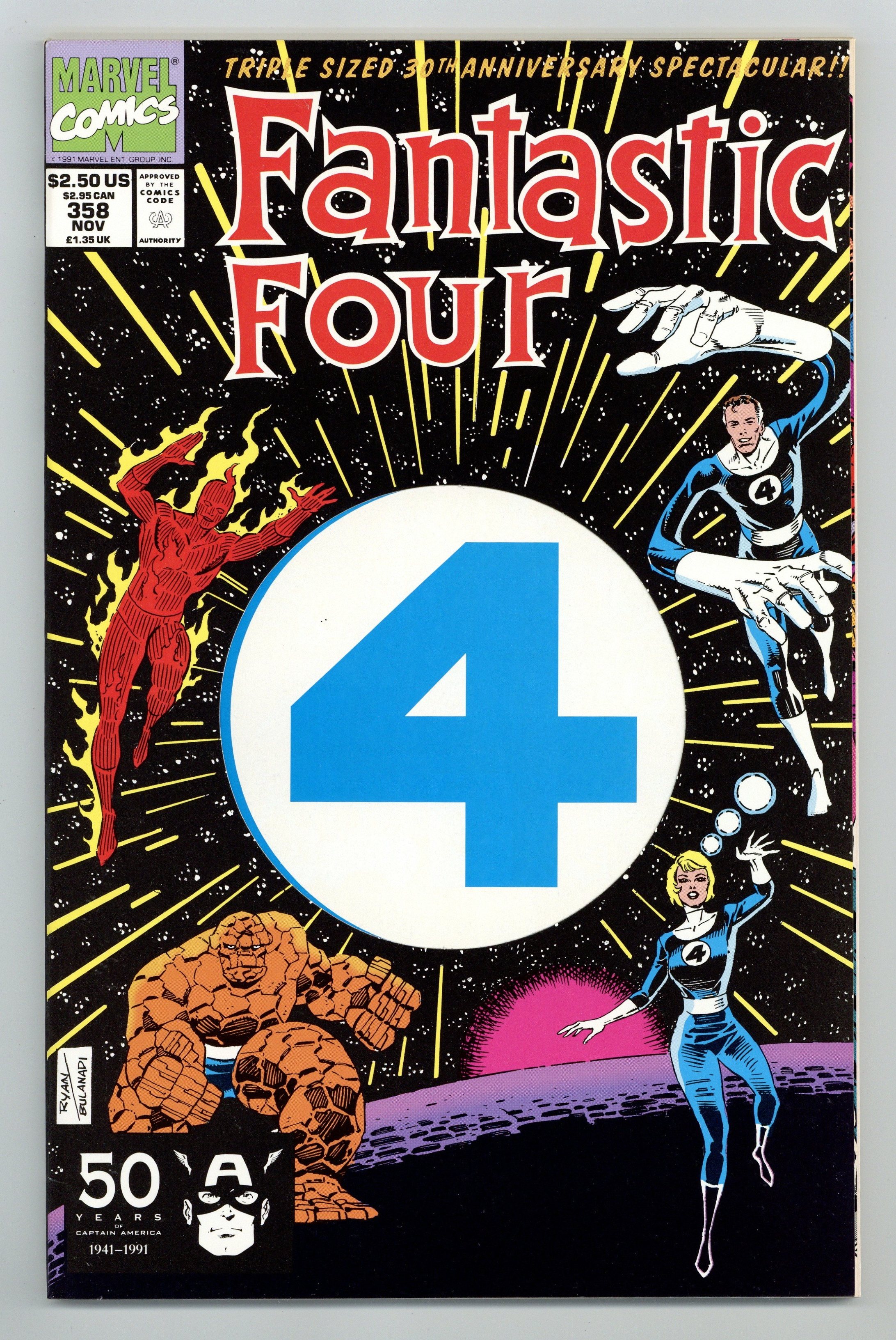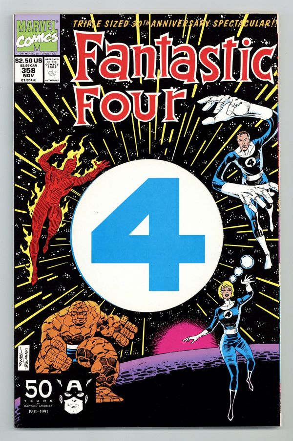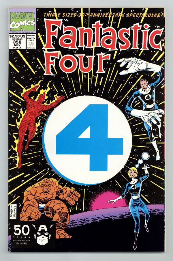 "What ever Happened to Alicia?!" Part 2 of 2. Story by Tom DeFalco. Art and cover by Paul Ryan and Danny Bulanadi. At long last it is finally revealed that the Alicia Masters whom the Human Torch married and has been around since Fantastic Four (1965-1996 1st Series) #265 has in fact been a Skrull spy named Lyja! So what ever happened to the real Alicia? The FF intend to find out. Don't miss this one folks. You'll be kicking yourself if you do. Includes the original synopsis for the creation of the Fantastic Four by Stan Lee. Also includes pin-ups: Blastaar by Mike Mignola, Annihilus by Mike MIgnola, FF vs. Molecule Man by Ron Garney and Dan Green, Rama-Tut by Paul Ryan and B. LaRosa, and Doctor Doom by Ron Frenz and Joe Sinnott. Plus, revealing dossiers on Mister Fantastic, the Thing, Invisible Woman, Human Torch, and Baxter Building. Pin-ups of memorable moments from FF history: The FF's origin by Al Milgrom, Meeting the Watcher by John Byrne, Meeting the Silver Surfer and Galactus by John Byrne, Meeting the Inhumans by Ron Lim, and Reed and Sue's wedding by John Romita, Sr. Includes the back-up tale "A Tale of Doom!" By Tom DeFalco and Arthur Adams. And finally, a 2-page spread of the greatest heroes in the Marvel Universe vs. an army of the Fantastic Four's greatest villains by Paul Ryan and Danny Bulanadi. 88 pages Cover price $2.50.