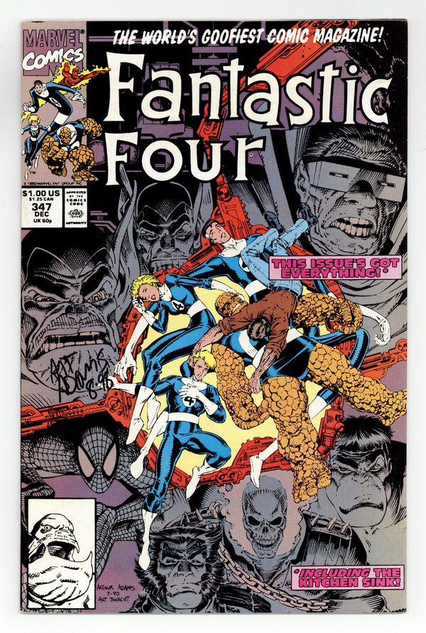 1st printing. Direct Edition. "Big Trouble on Little Earth (or is it...Where Creatures Roam?)!" Part 1 of 3. Guest-starring Spider-Man, Wolverine, Ghost Rider, and the Hulk. Story by Walt Simonson. Art and cover by Arthur Adams and Art Thibert. Can it be true? Reed Richards, the Human Torch, and the ever-lovin' blue-eyed Thing of the Fantastic Four are dead?! Now, it's up to a monster, an outlaw hero, a mutant, and the Spirit of Vengeance to solve this mystery and stop an unseen threat to mankind before it's too late. Can the Incredible Hulk, Ghost Rider, Wolverine, and the Amazing Spider-Man play nice together long enough to stop Armageddon? 40 pgs. Cover price $1.00.