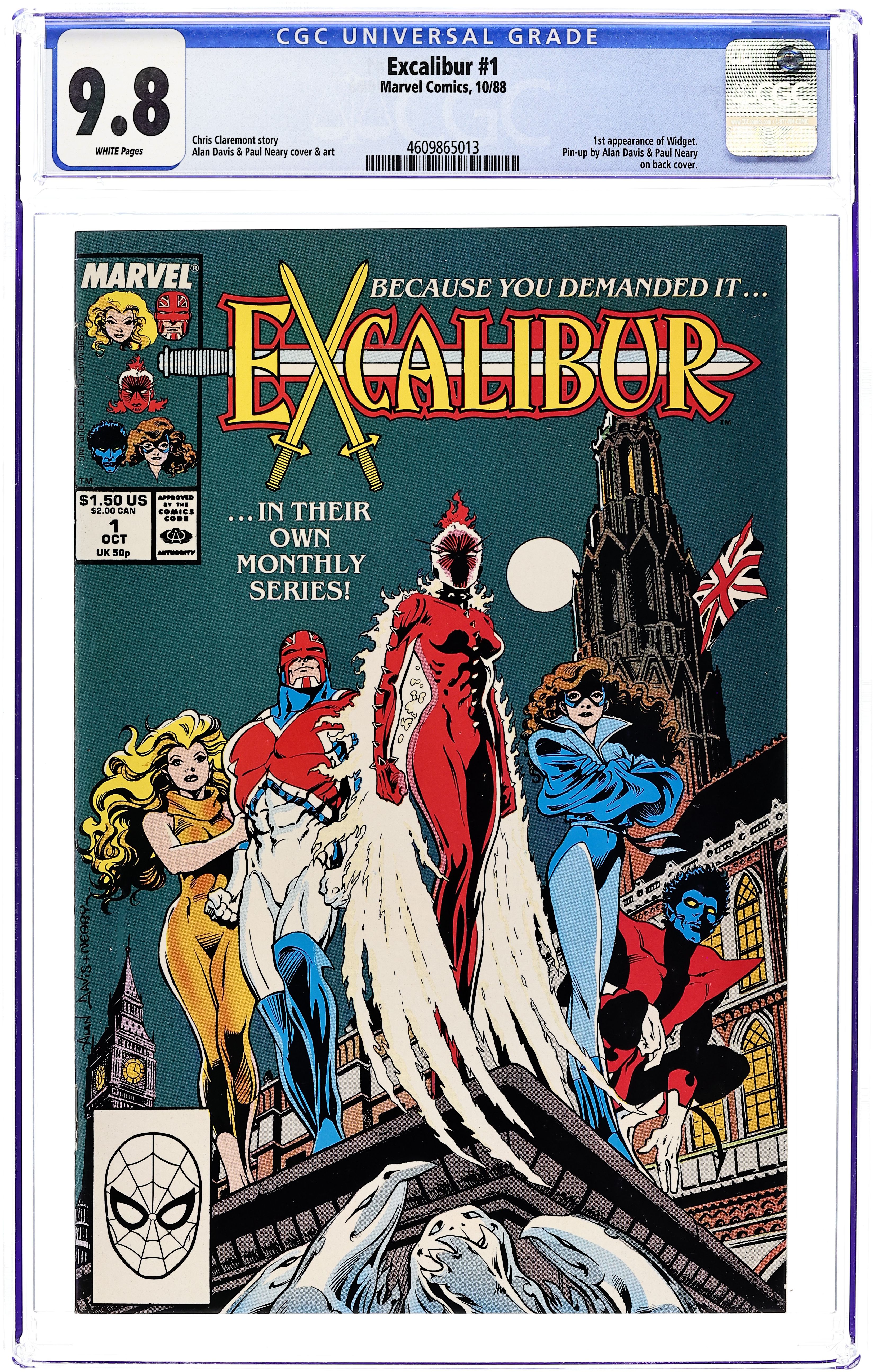 Direct Edition. Part 1 of 2 – "Warwolves of London!" Story by Chris Claremont. Art and cover by Alan Davis and Paul Neary. NOTE: This tale picks up after the events of Excalibur: The Sword is Drawn (1988). The world believes the mutant heroes the X-Men are dead (see Fall of the Mutants). Kitty Pryde and Nightcrawler, almost fully recovered from severe injuries sustained during the Mutant Massacre, join the psychic Rachel Summers (Phoenix II), the British superman Captain Britain and his elf lover, Meggan, to form the super team Excalibur. However, dangerous adversaries are gathering and this new group will have to learn to be a team if they are going to survive the coming days. Featuring a full page pin-up of Phoenix II on back cover by Alan Davis and Paul Neary. 32 pages, FC. NOTE: 1st appearance of Widget. Cover price $1.50.