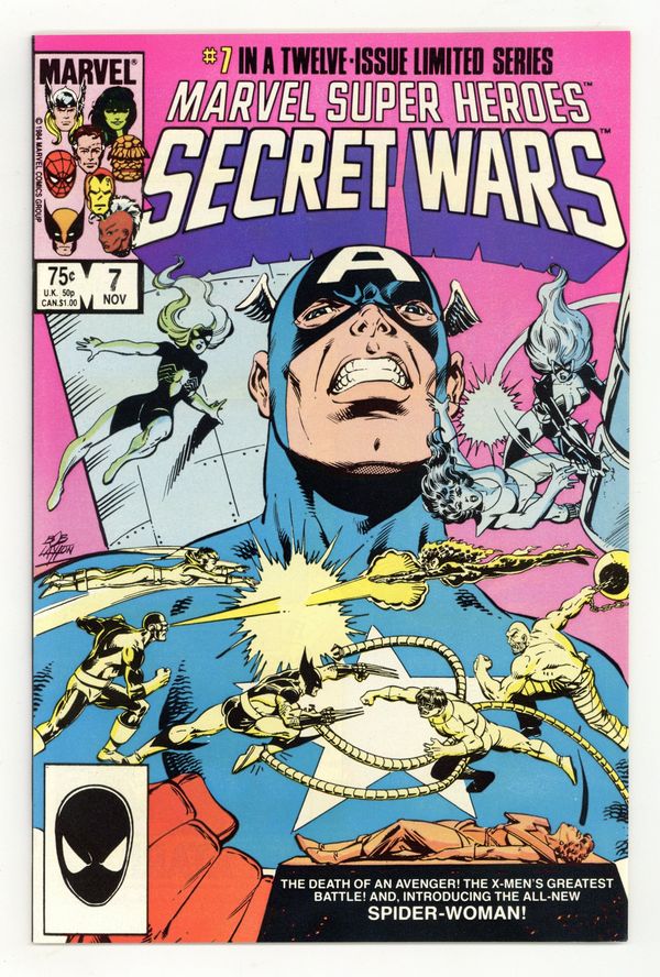 Tags: Secret Wars (1984) (part 7)$12.00Direct Edition. 1st appearance of Spider-Woman II (Julia Carpenter). "Berserker!" Part 7 of 12. Story by Jim Shooter. Art by Mike Zeck and John Beatty. Introducing Marvel's newest super-hero, Spider-Woman, a refugee from the displaced Denver, Colorado (NOTE: The Beyonder created Battleworld from pieces of hundreds of worlds from across the universe, Denver was one of those pieces). Plus, when the villains dump the Wasp's lifeless body into the heroes' camp, the Savage She Hulk decides to pay the bad guys a visit for some payback. But, has the emerald heroine finally bitten off more than she can chew? 36 pages, full color. Cover price $0.75.