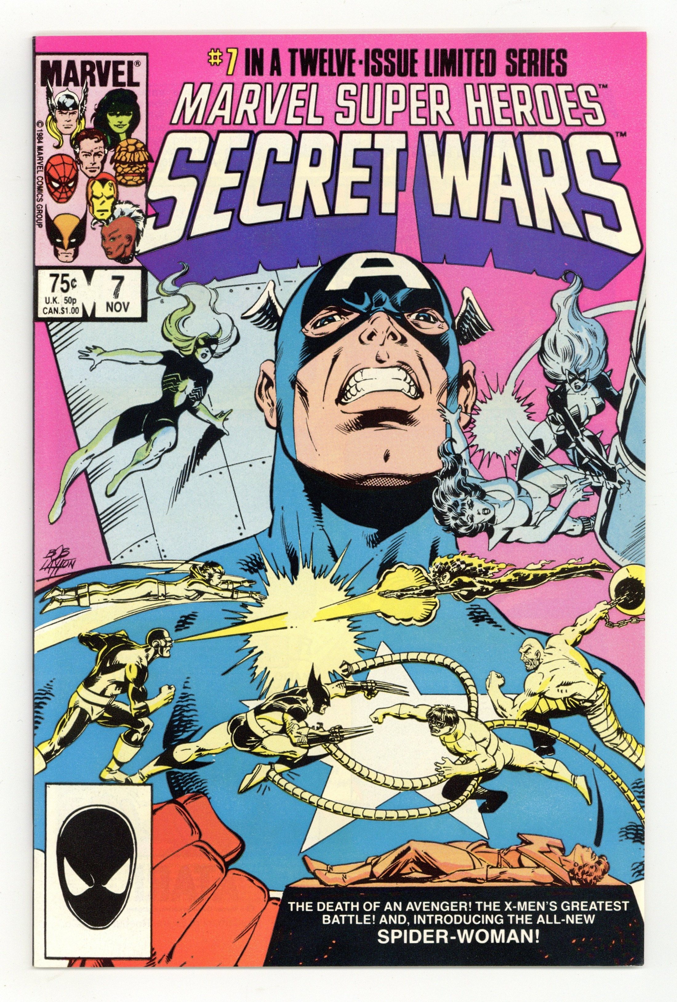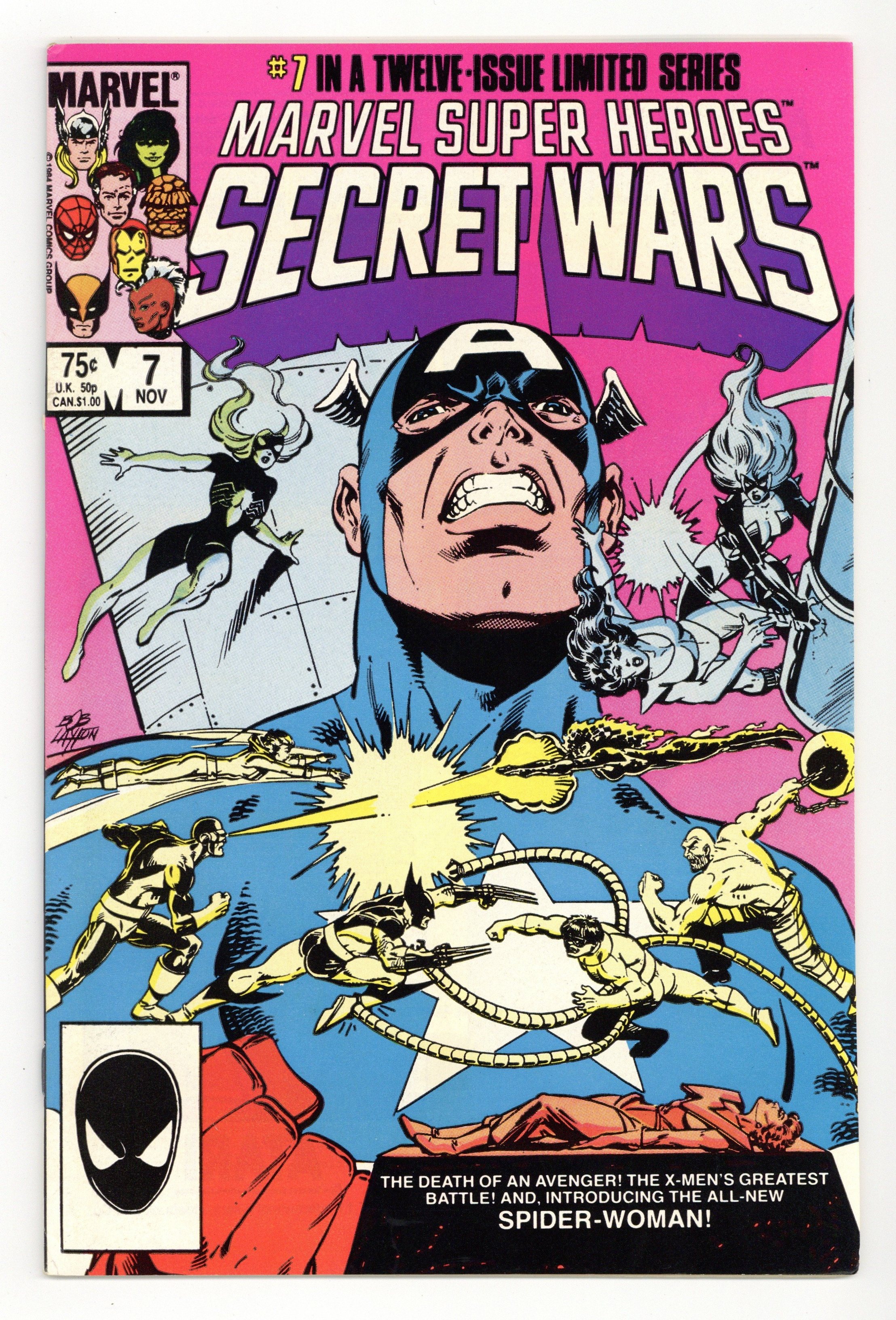 Tags: Secret Wars (1984) (part 7)$18.00Direct Edition. 1st appearance of Spider-Woman II (Julia Carpenter). "Berserker!" Part 7 of 12. Story by Jim Shooter. Art by Mike Zeck and John Beatty. Introducing Marvel's newest super-hero, Spider-Woman, a refugee from the displaced Denver, Colorado (NOTE: The Beyonder created Battleworld from pieces of hundreds of worlds from across the universe, Denver was one of those pieces). Plus, when the villains dump the Wasp's lifeless body into the heroes' camp, the Savage She Hulk decides to pay the bad guys a visit for some payback. But, has the emerald heroine finally bitten off more than she can chew? 36 pages, full color. Cover price $0.75.