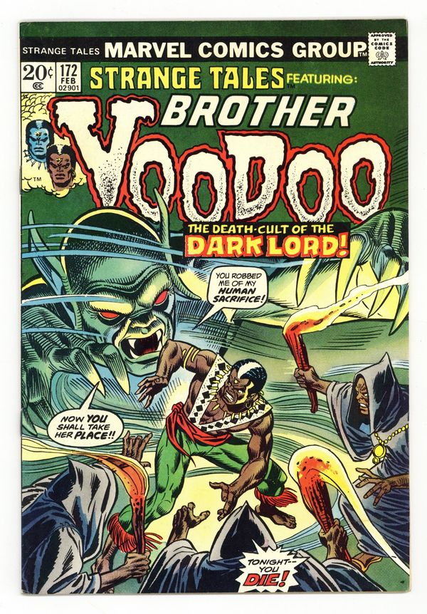 Starts Dec 8 Cover pencils by Gil Kane, inks by Frank Giacoia. "Fiend in the Fog," script by Len Wein, pencils by Gene Colan, inks by Dick Giordano; Outside his home in New Orleans, Brother Voodoo spots a young girl being swept away in the Mississippi River; Diving into the water, Voodoo manages to save the girl and bring her back to his home; There he learns that she is Loralee Tate, daughter of Samuel Tate the local chief of police; She tells Brother Voodoo that she has been stalked by a group called the Cult of the Darklord. The reprint of an old weird story, "Voodoo," script by Carl Wessler, art by Gene Colan. 36 pgs., full color. Cover price $0.20.
