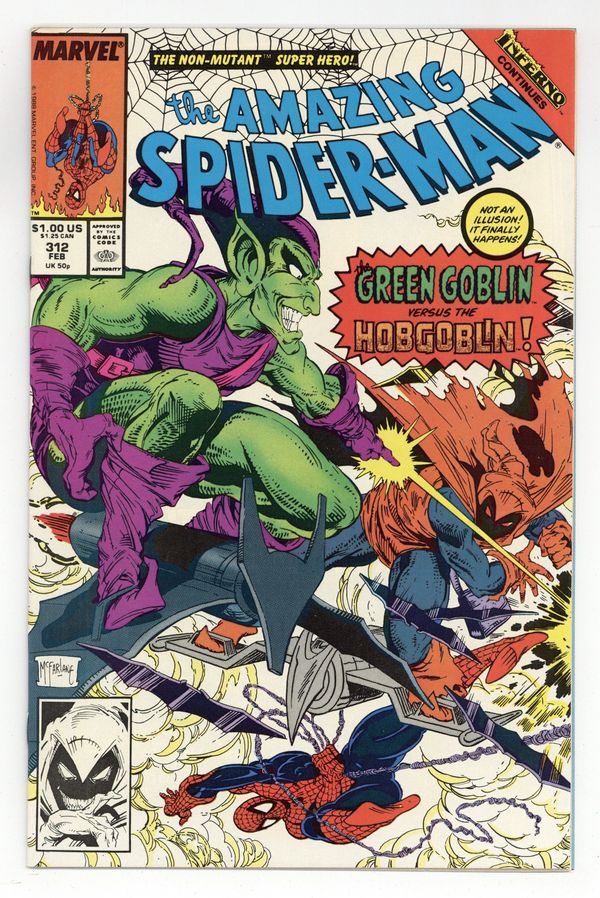 Direct Edition. "The Goblin War!" Inferno crossover. Script by David Michelinie. Art by Todd McFarlane. Cover by Todd McFarlane. Story continues from Web of Spider-Man 47. With his family in danger, the Green Goblin rides again! Oh my, does Harry know what he's doing by challenging the might of the Hobgoblin? In the skies above the Osborn Chemical Company, the pumpkin bombs fly as the goblins clash! And naturally your friendly neighborhood Spider-Man is caught in the middle! Meanwhile the effects of Inferno begin affecting Dr. Curt Connors. Uh-oh, could an appearance from the Lethal Lizard be in the near future? Yesss! Story continues in Spectacular Spider-Man 147. Cameo appearances by Mary Jane Watson, Liz Osborn, and J. Jonah Jameson. (Note: Harry Osborn dons the garb of the Green Goblin for the first time since Amazing Spider-Man 180.) 36 pgs. Cover price $1.00.