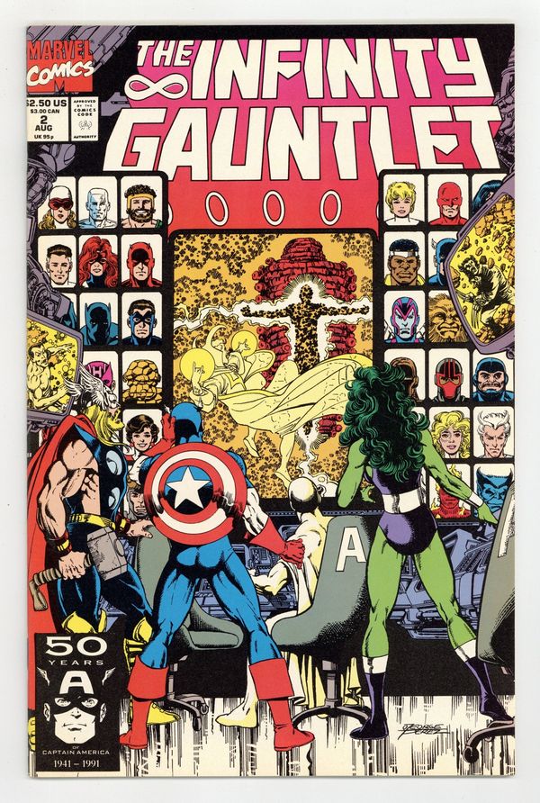 Tags: Infinity Gauntlet (part 2)$21.00Direct Edition. Part 2 of 6. "From Bad to Worse!" Story by Jim Starlin. Art by George Perez and Joe Rubinstein. Wielding nigh-omnipotent power, the mad Titan, Thanos, eradicated half the population in the universe with but a snap of his fingers. Now, the surviving heroes of Earth are left to deal with the chaos that has ensued in the wake of such a catastrophe. Meanwhile, Odin the Lord of Asgard, calls a meeting of the Sky-Fathers (Zeus, Osiris, Manitou, and others) to discuss this disturbance in the universal order of things. Plus, the man who once brought an end to the Mad Titan returns from the grave to lend a hand. But can even the heroes trust the intentions of Adam Warlock? 48 pages. Cover price $2.50.