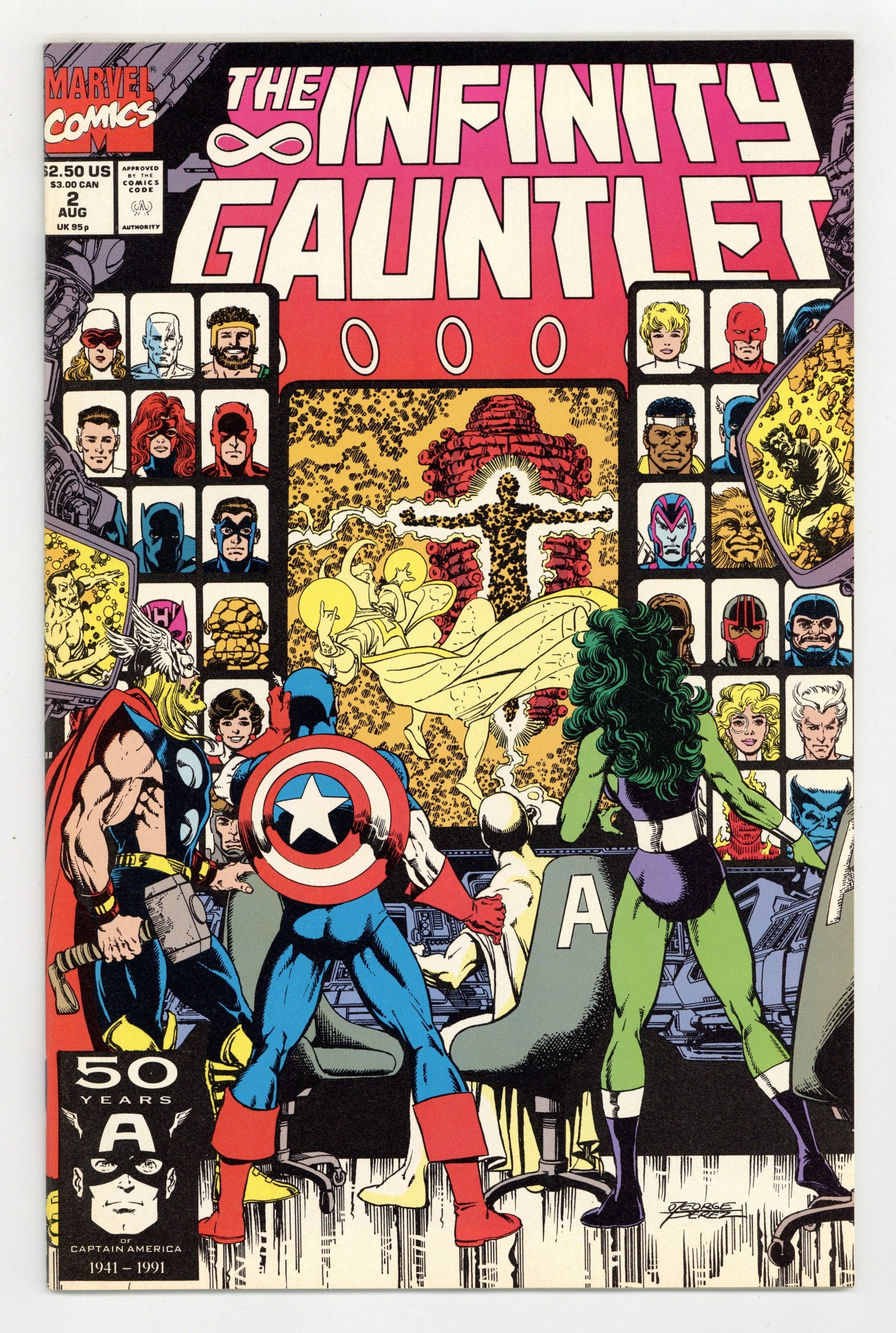 Tags: Infinity Gauntlet (part 2)$9.40Direct Edition. Part 2 of 6. "From Bad to Worse!" Story by Jim Starlin. Art by George Perez and Joe Rubinstein. Wielding nigh-omnipotent power, the mad Titan, Thanos, eradicated half the population in the universe with but a snap of his fingers. Now, the surviving heroes of Earth are left to deal with the chaos that has ensued in the wake of such a catastrophe. Meanwhile, Odin the Lord of Asgard, calls a meeting of the Sky-Fathers (Zeus, Osiris, Manitou, and others) to discuss this disturbance in the universal order of things. Plus, the man who once brought an end to the Mad Titan returns from the grave to lend a hand. But can even the heroes trust the intentions of Adam Warlock? 48 pages. Cover price $2.50.